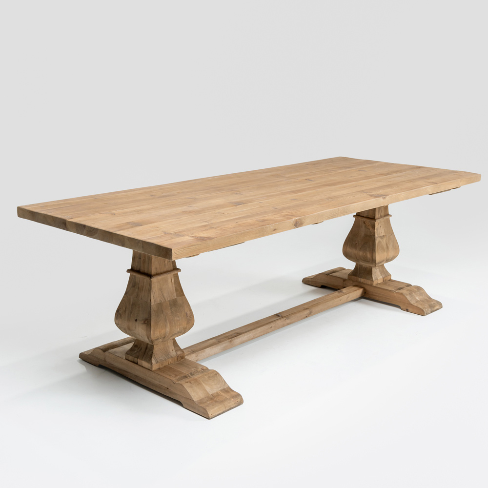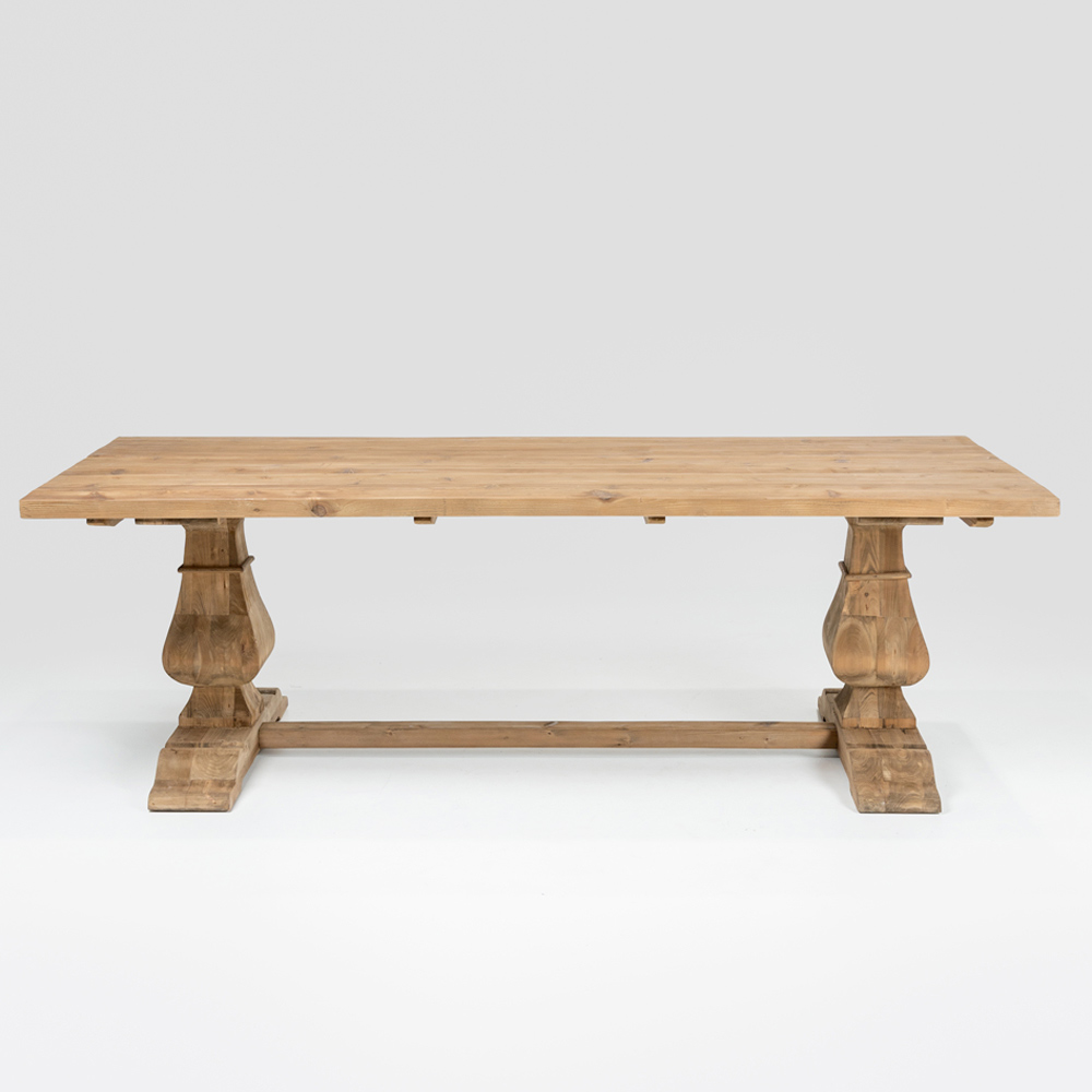 Dieser natürlich gealterte Kieferntisch besticht durch seinen authentischen und zeitlosen Charme und eignet sich ideal zur Aufwertung großer Räume wie Ess- oder Wohnzimmer. Die gealterte Oberfläche betont die Holzstruktur und hebt Maserung, Astlöcher und Unregelmäßigkeiten hervor, die jeden Tisch zu einem Unikat machen.