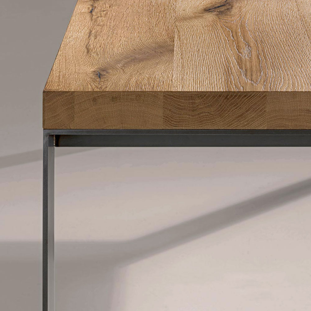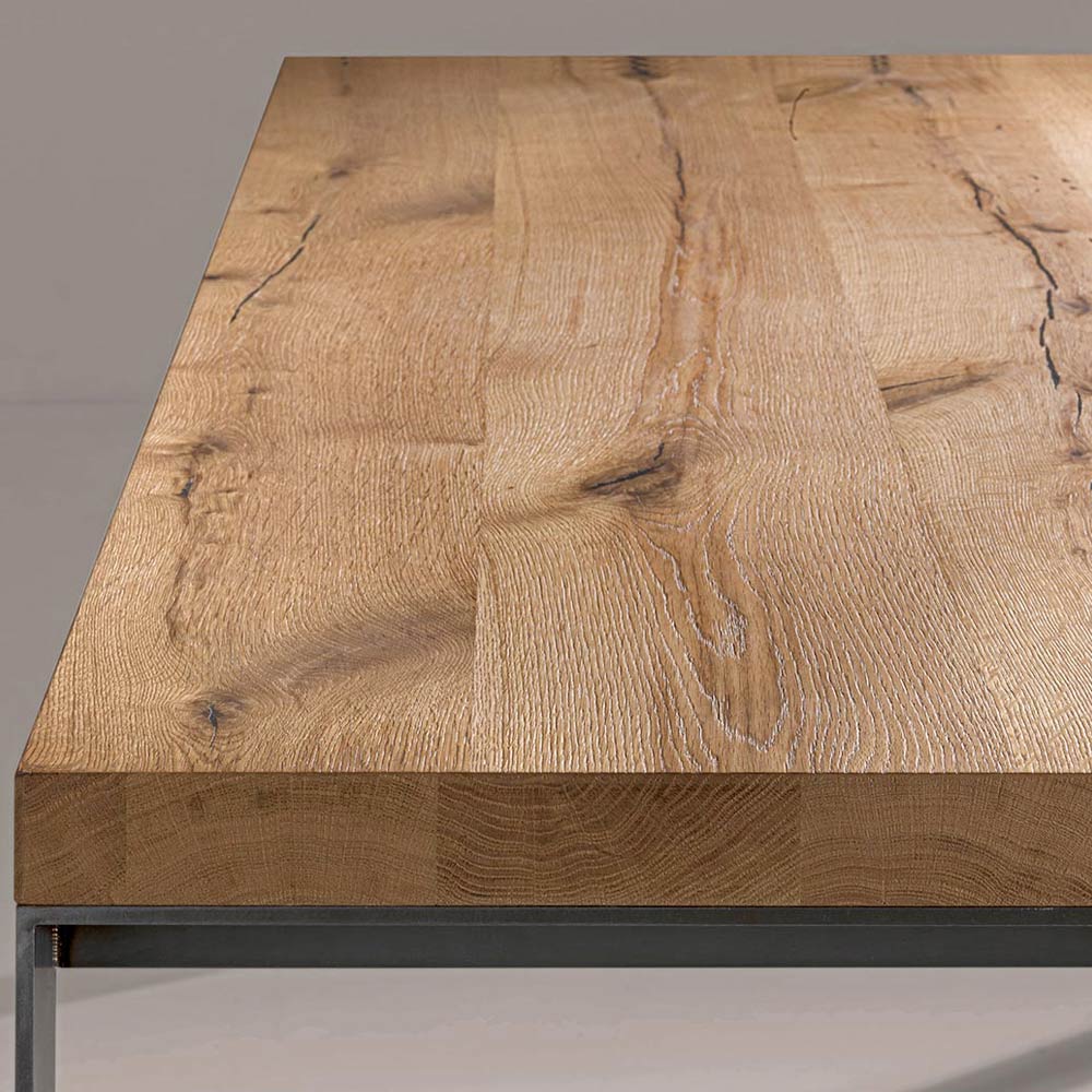 Fester Tisch , furniert auf Spanplatte aus natürlicher gespaltener Eiche, mit Metallbeinen in Eisenoptik . Maße H 78 cm, Dicke 6 cm.