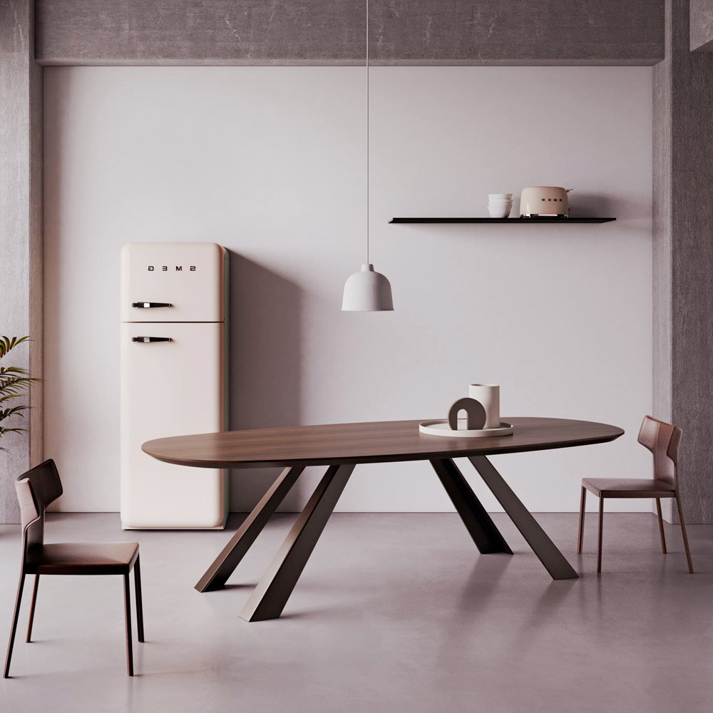 Fester Tisch mit elliptischer Platte und abgeschrägter Kante, hergestellt in Italien.