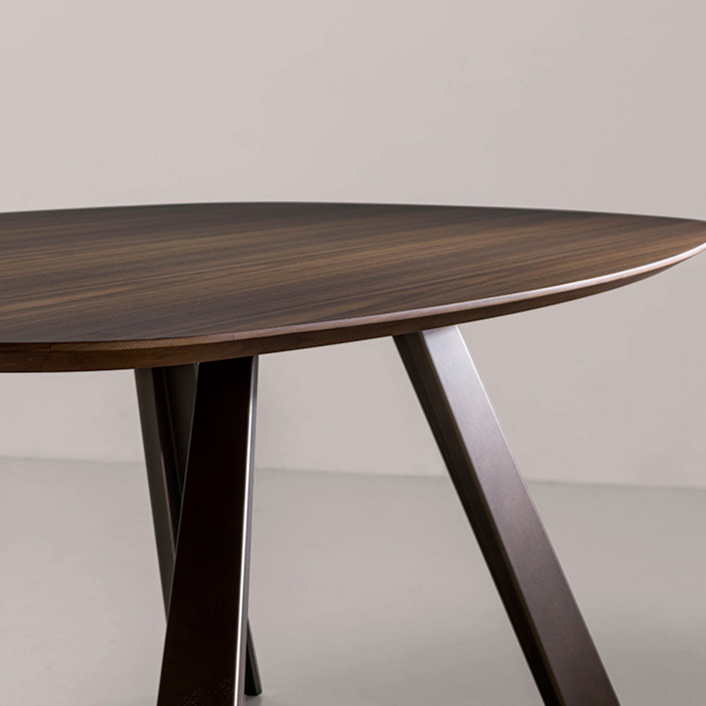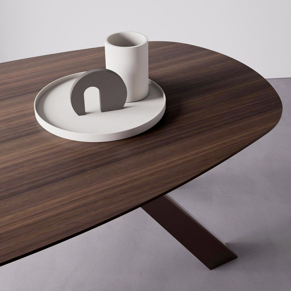 Fester Tisch mit elliptisch abgeschrägter Platte aus eukalyptusfurnierter Tischlerplatte und Beinen aus lackiertem Metall mit Bronze-Finish . Abgeschrägte Oberkante. Abmessungen H 77 cm, Dicke 3 cm.