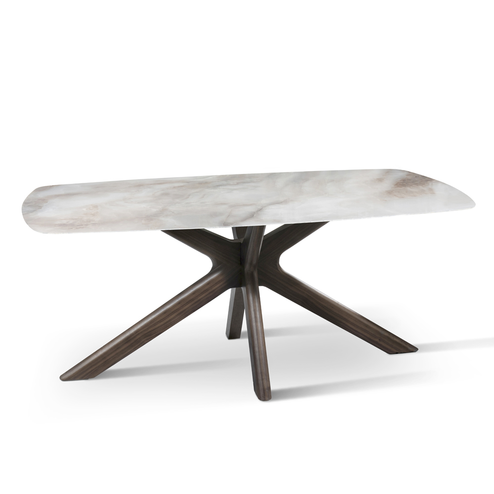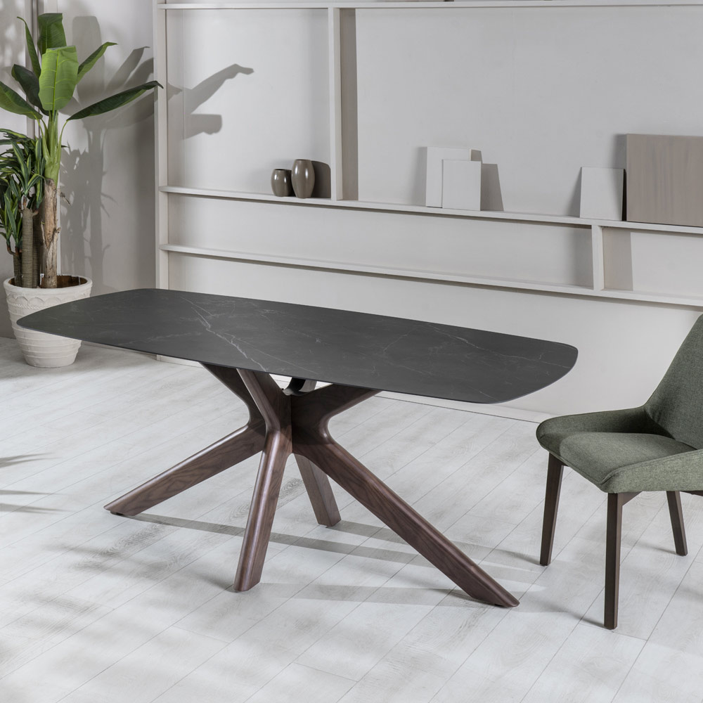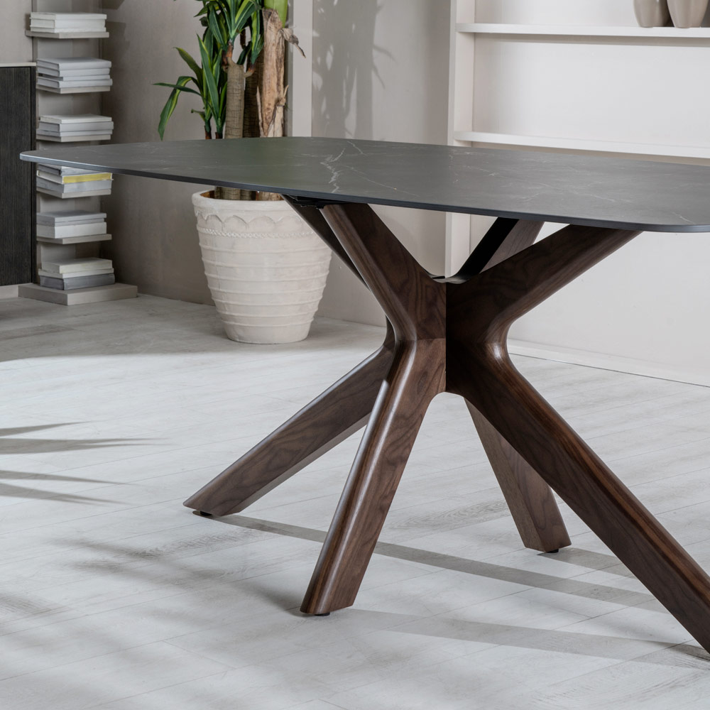 Es handelt sich um einen raffinierten und originellen Tisch, bei dem fließende und weiche Linien miteinander spielen und Details von großer visueller Stärke schaffen. Die Keramikplatte ruht sanft auf dem sternförmigen Sockel aus massivem Walnussholz. Als Ergebnis einer Forschung, die die unterschiedlichsten Stile und Inspirationen erforscht, ist es ein wahrer Protagonist des Wohnbereichs und fügt sich harmonisch sowohl in Umgebungen mit modernem Design als auch in Räume ein, die Luxus und klassischen Stil bevorzugen.