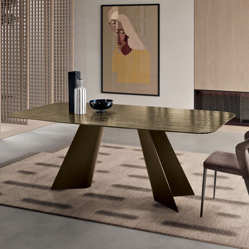 Das markante , lackierte Metallgestell besteht aus zwei schlanken, sanft V-förmigen Elementen, die sich nach oben verjüngen und so eine elegante und dynamische Struktur bilden. Diese Gestaltung verleiht dem Tisch eine optische Leichtigkeit und gewährleistet gleichzeitig Stabilität und Festigkeit.