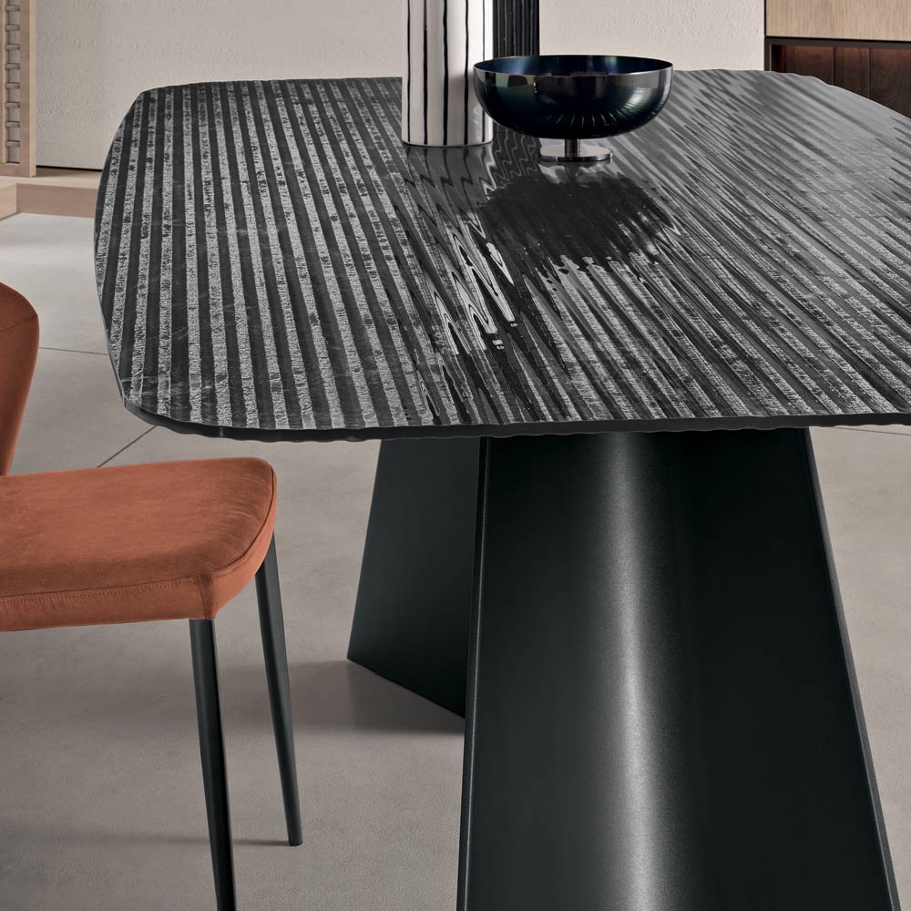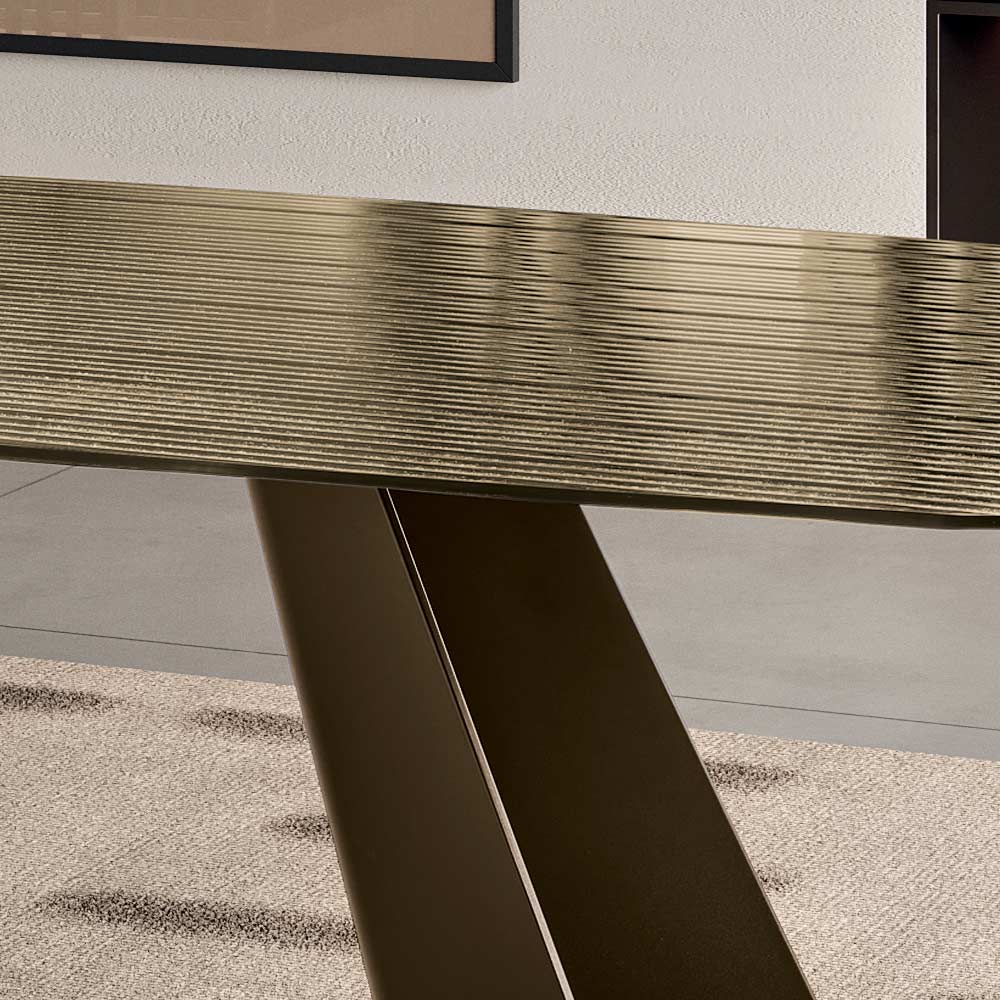 Ein eleganter, in Italien gefertigter Designer-Esstisch, der Esszimmer oder Wohnbereich stilvoll aufwertet. Besonders hervorzuheben ist die rückseitig versilberte, geriffelte Glasplatte – ein leuchtendes Material, das das Licht reflektiert, faszinierende visuelle Effekte erzeugt und dem Raum eine edle Note verleiht.