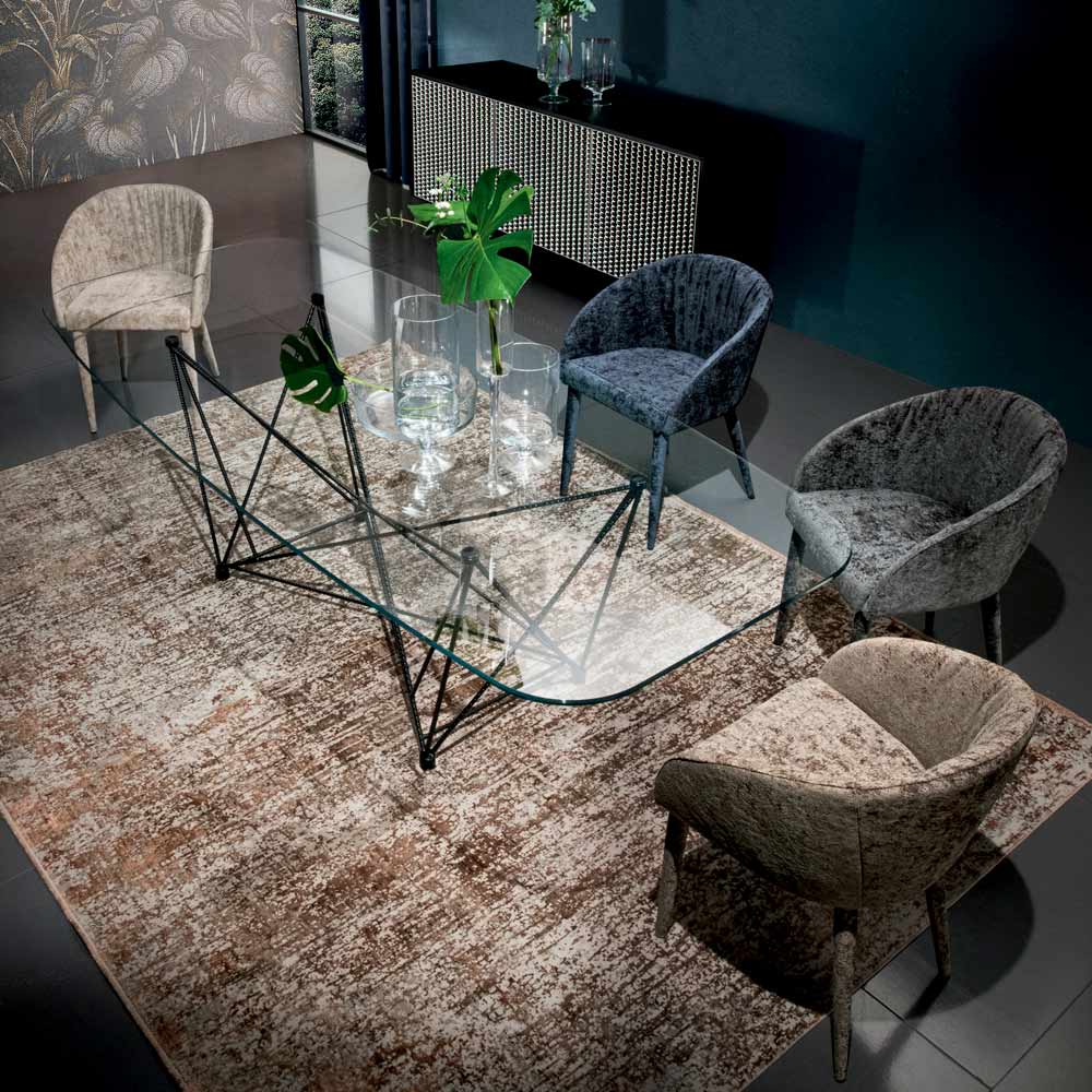 visuelle Spiel von Linien und Formen, das durch das Stahlgestell entsteht und dem Tisch