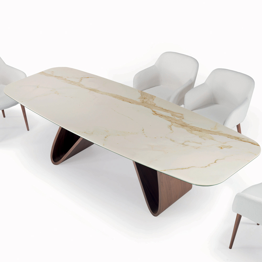 Dank der Form des Untergestells und der verfügbaren Oberflächenausführungen ist der Tisch in der Lage, jeder Alltags- und Objektumgebung einen