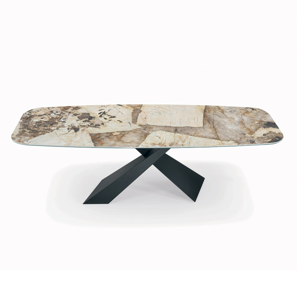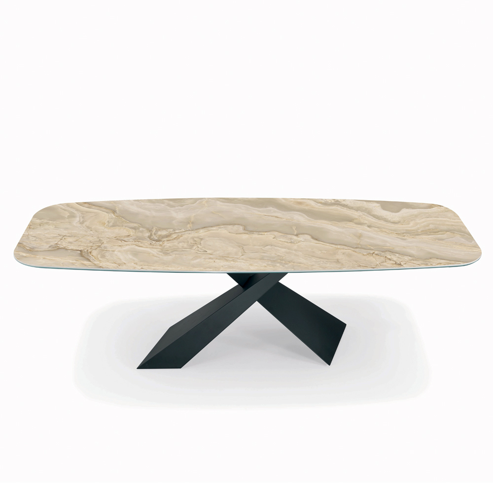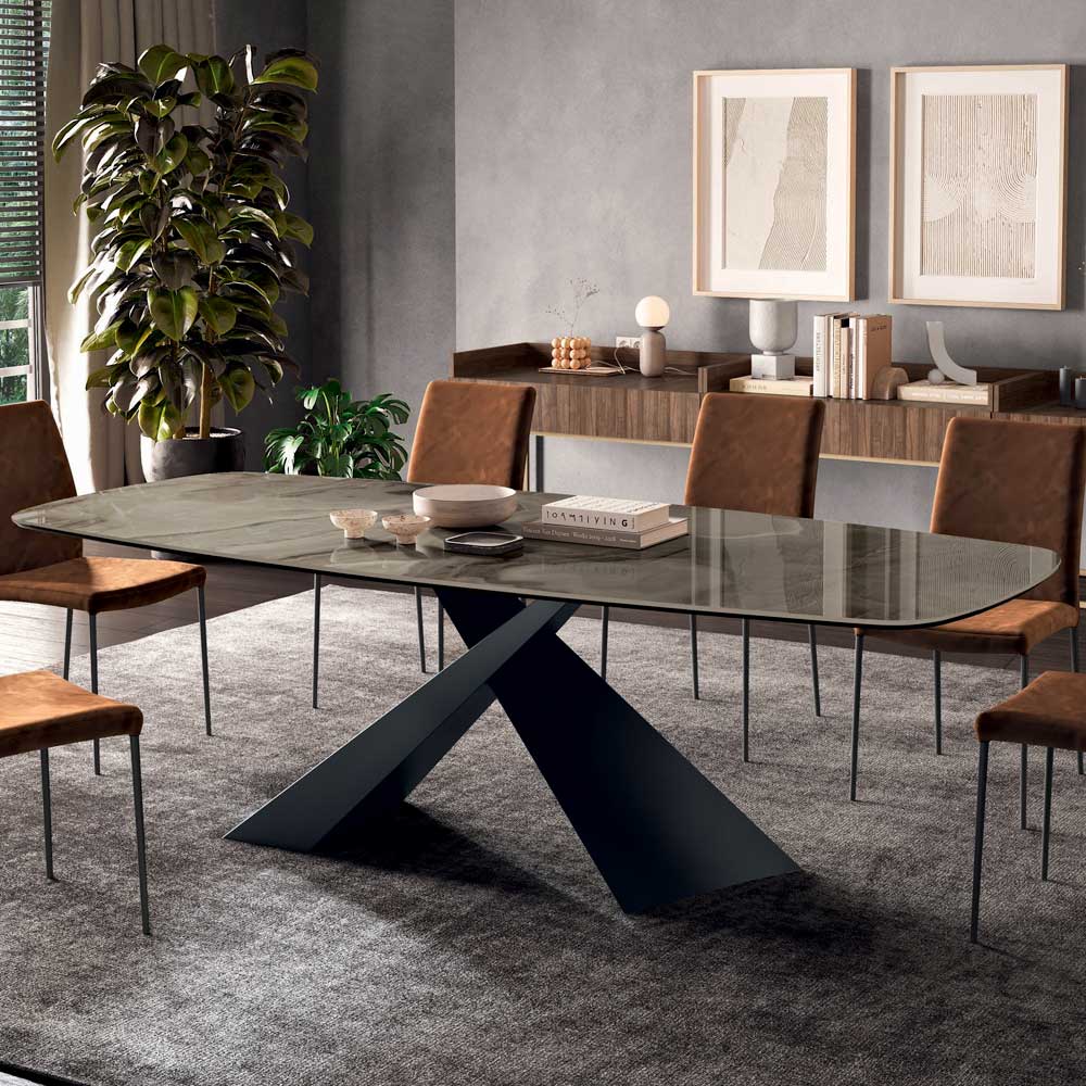 ungewöhnliche X-Form des Untergestells verleiht dem Tisch eine