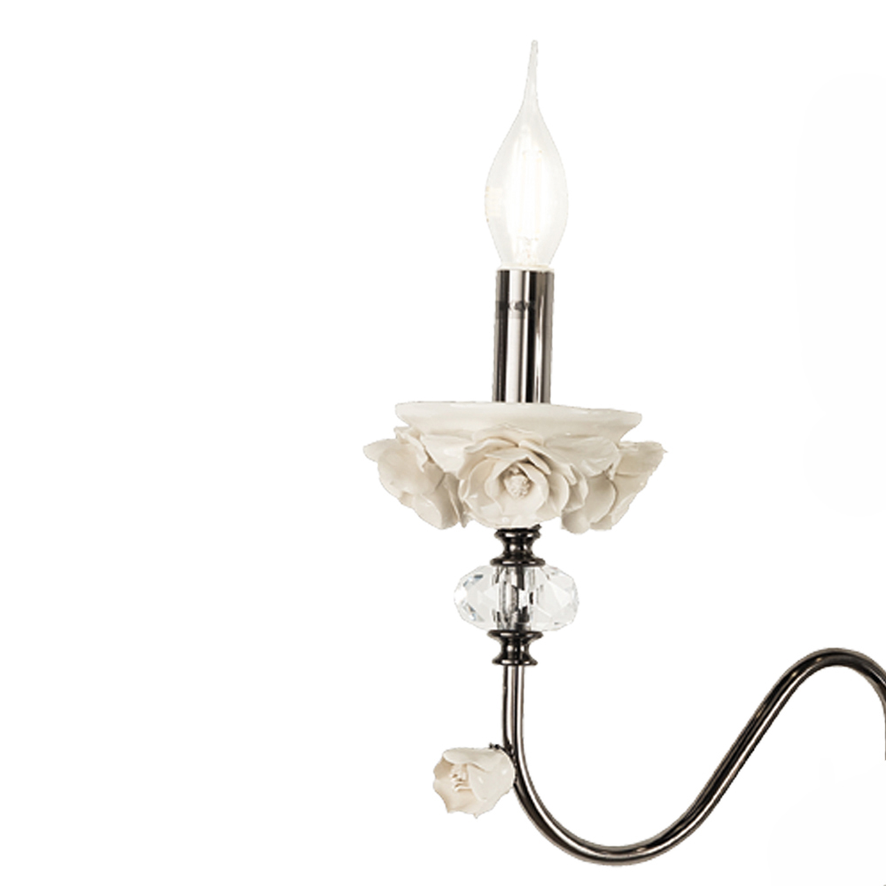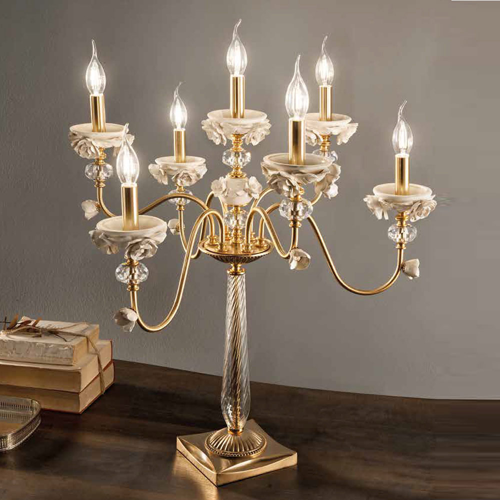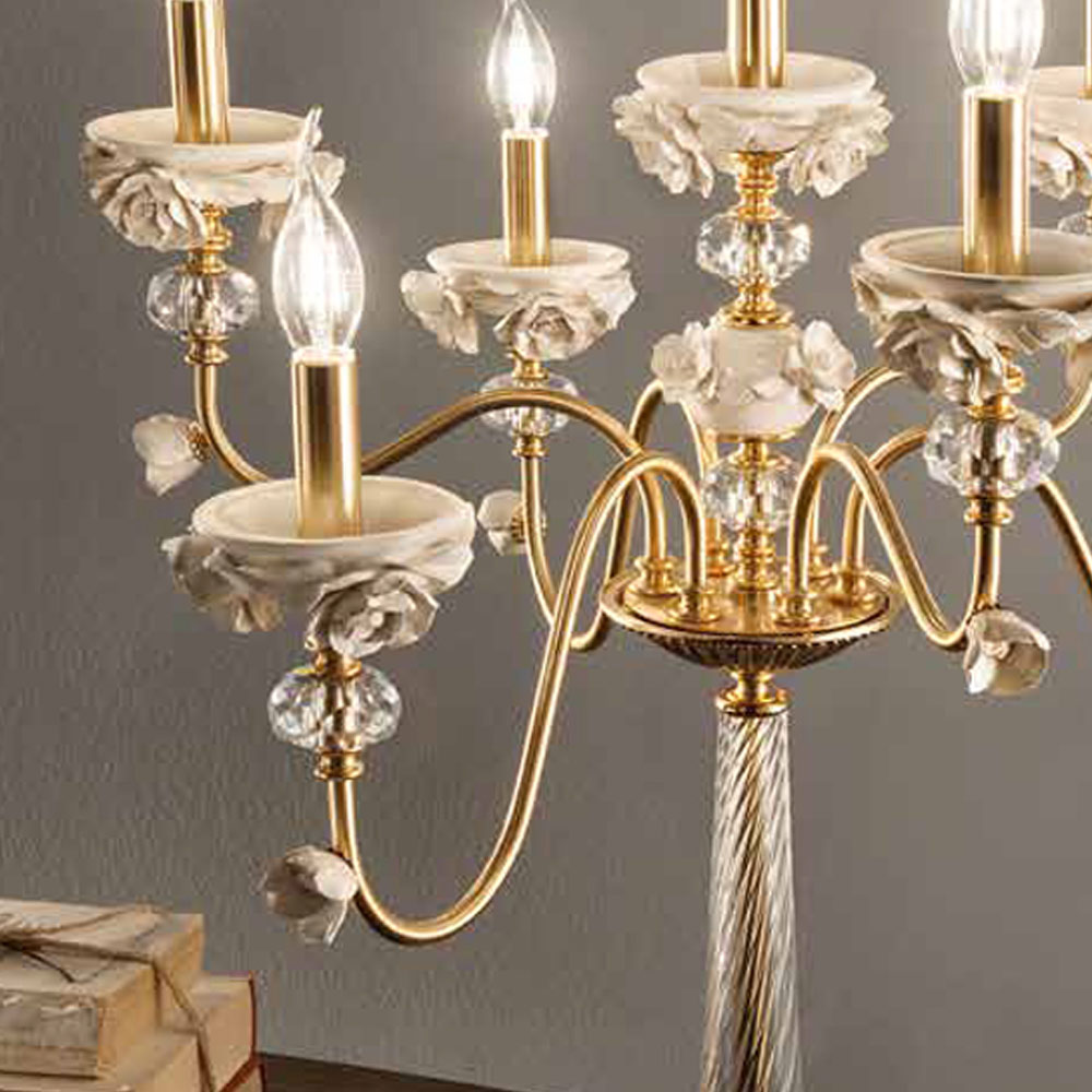 Flambeaux-Lampe mit 7 Lichtern aus Porzellan und mundgeblasenem Glas, Luxus made in Italy.
