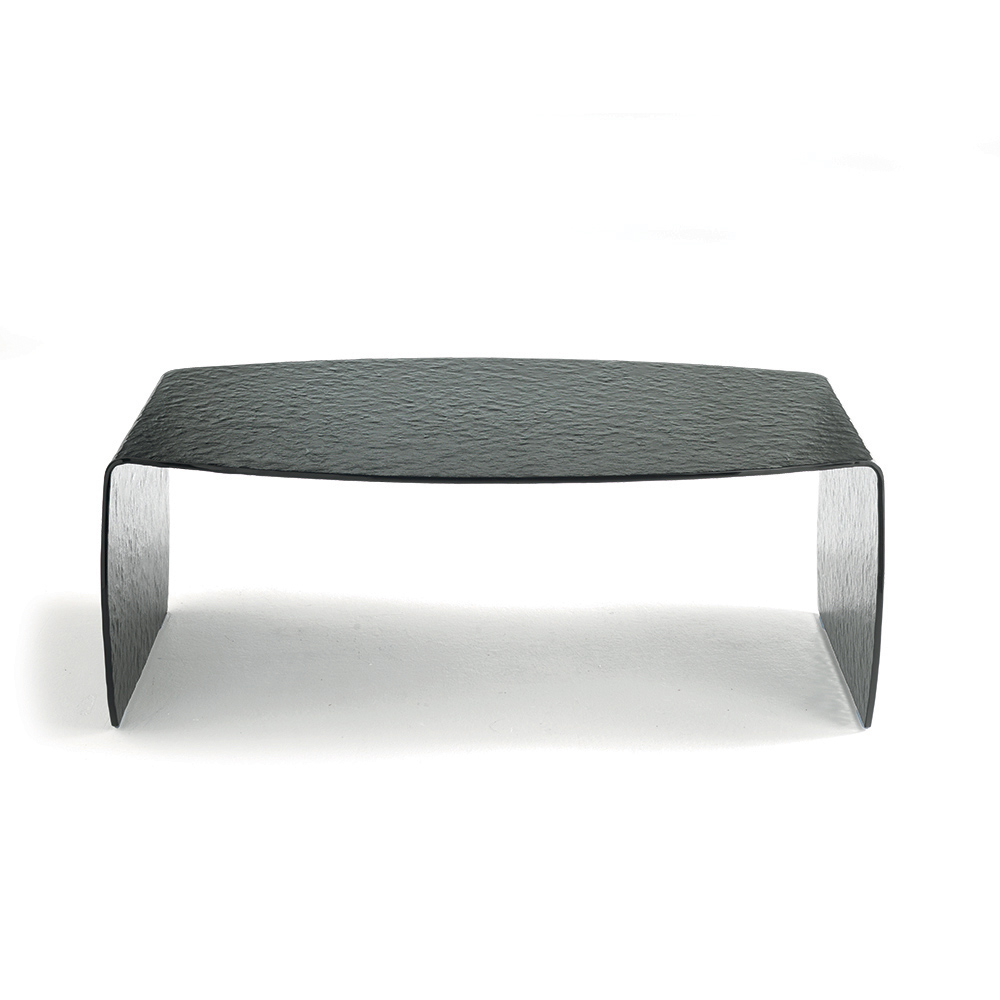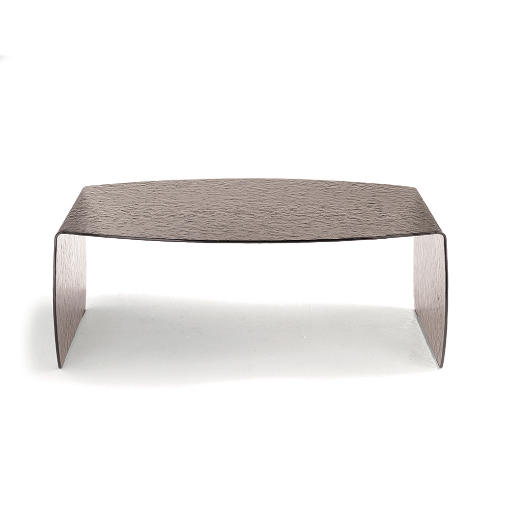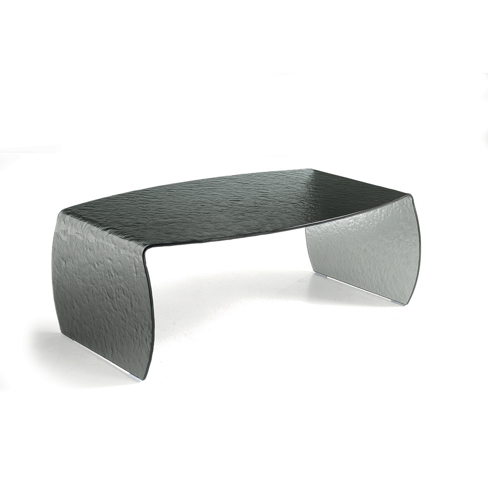 Dieser aus einer einzigen gebogenen Klarglasscheibe gefertigte Couchtisch besticht durch seine gehämmert wirkende Oberfläche , die ihm Tiefe verleiht und ein elegantes Lichtspiel erzeugt. Die Glasstruktur verstärkt das natürliche Licht und lässt den Raum heller und luftiger wirken.
