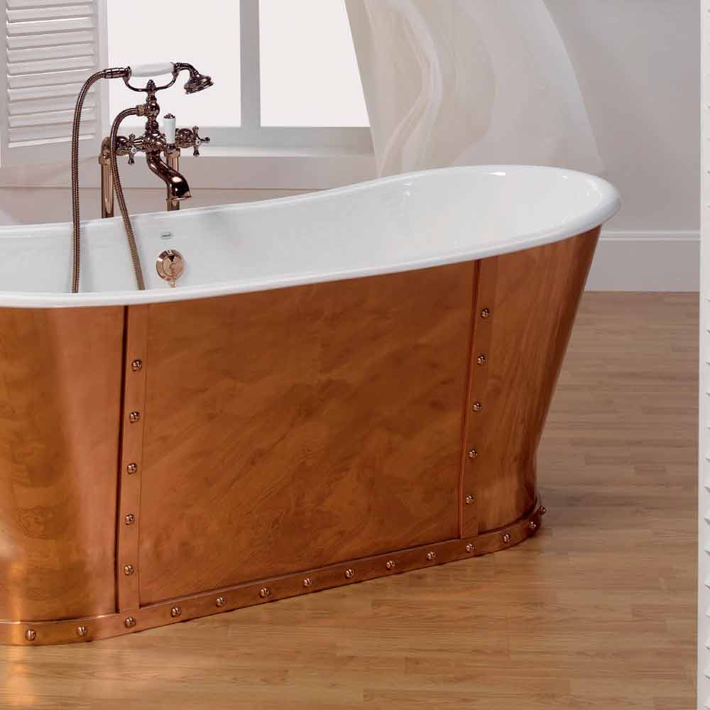 Freistehende Badewanne komplett aus Gusseisen auf dem Boden. Innen 2 mm Titan emailliert und außen verkupfert. Badewanne, die die Spitze des Luxus darstellt!