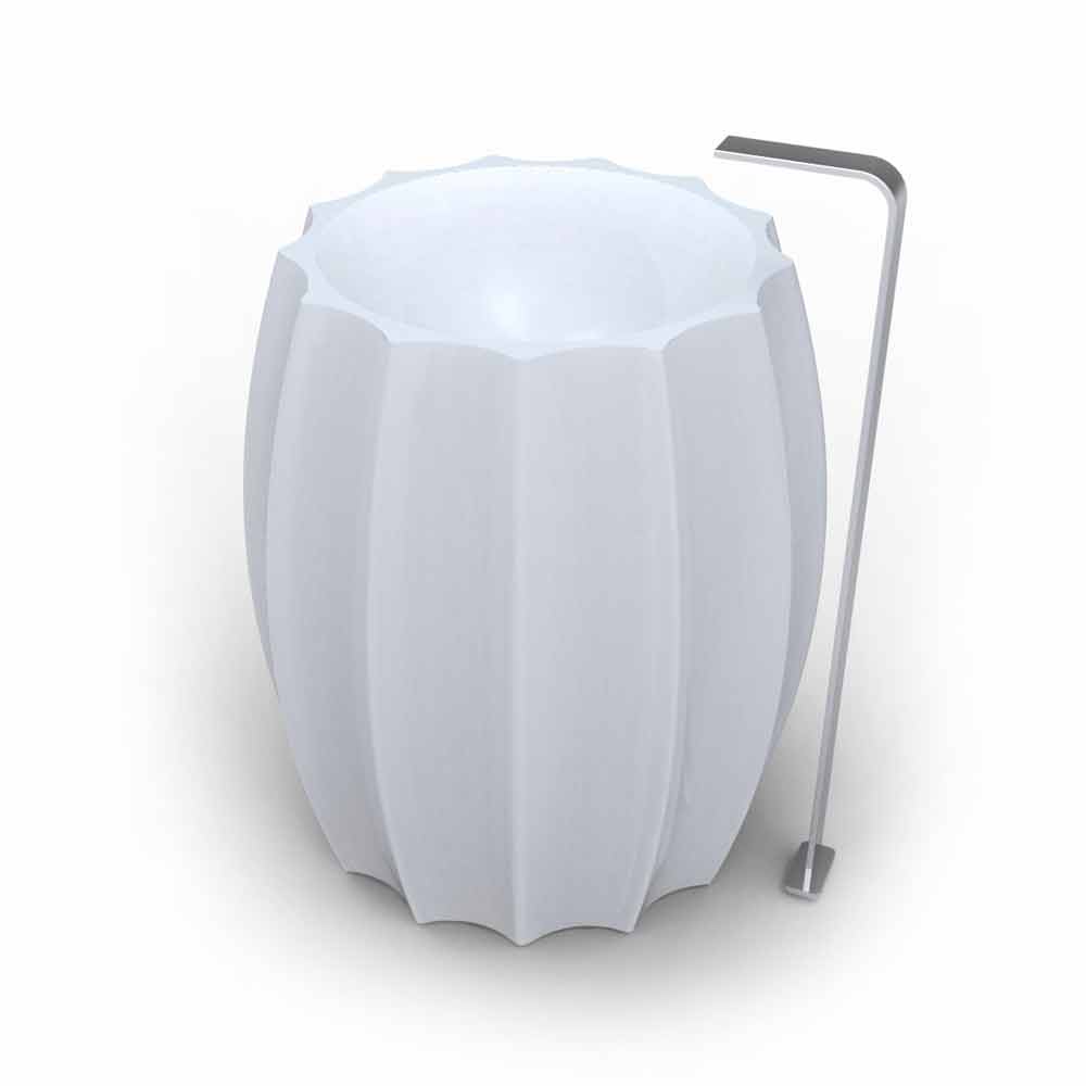 Freistehendes Waschbecken aus Solid Surface; mit Formen, die von der Natur und der Pflanzenwelt inspiriert sind. Seine üppigen und "gerippten" Linien weisen ein Profil auf, das an die Form einer Sukkulente und insbesondere eines "Kaktus" - von dem es seinen Namen hat - erinnert, jedoch an der Spitze "geschnitten" ist. Neben dem auf der Vorderseite sichtbaren "gestreiften" Höhenprofil verfügt es über ein komfortables halbkugelförmiges Becken. Ergonomisch, da auch die seitlichen Rippen ohnehin abgerundet sind. Waschbecken in zwei verschiedenen Farbvarianten erhältlich: Weiß (RAL9003) oder Schwarz (RAL9005).