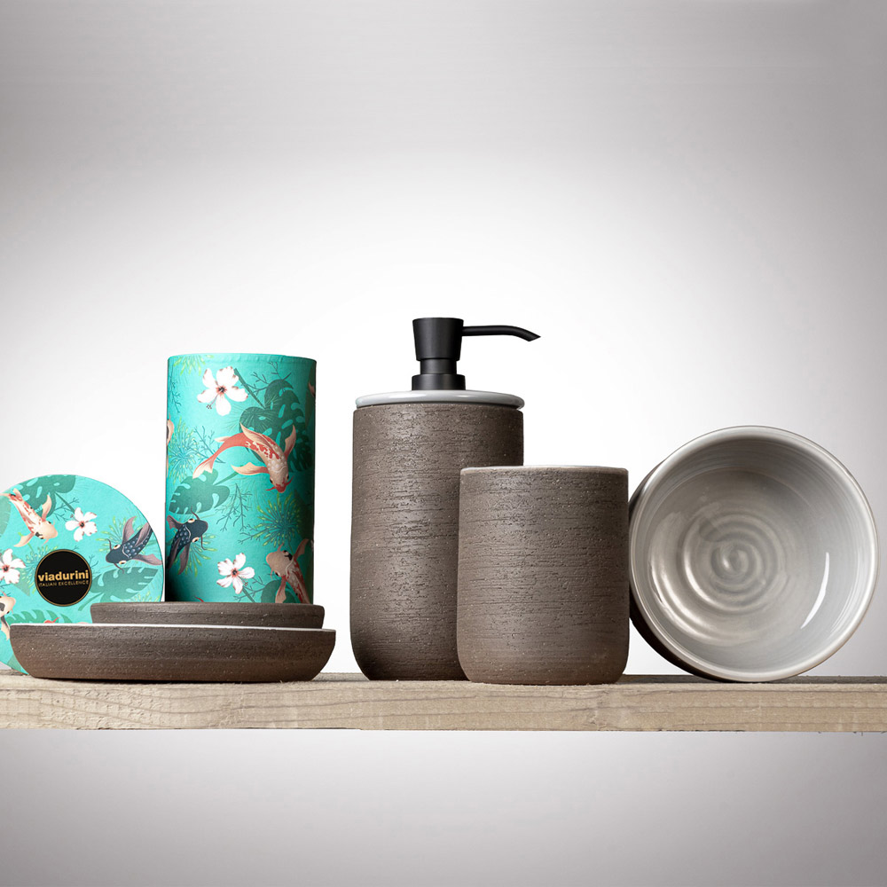 Badaccessoires aus feuerfestem Ton mit grauer Innenausstattung Made in Italy.