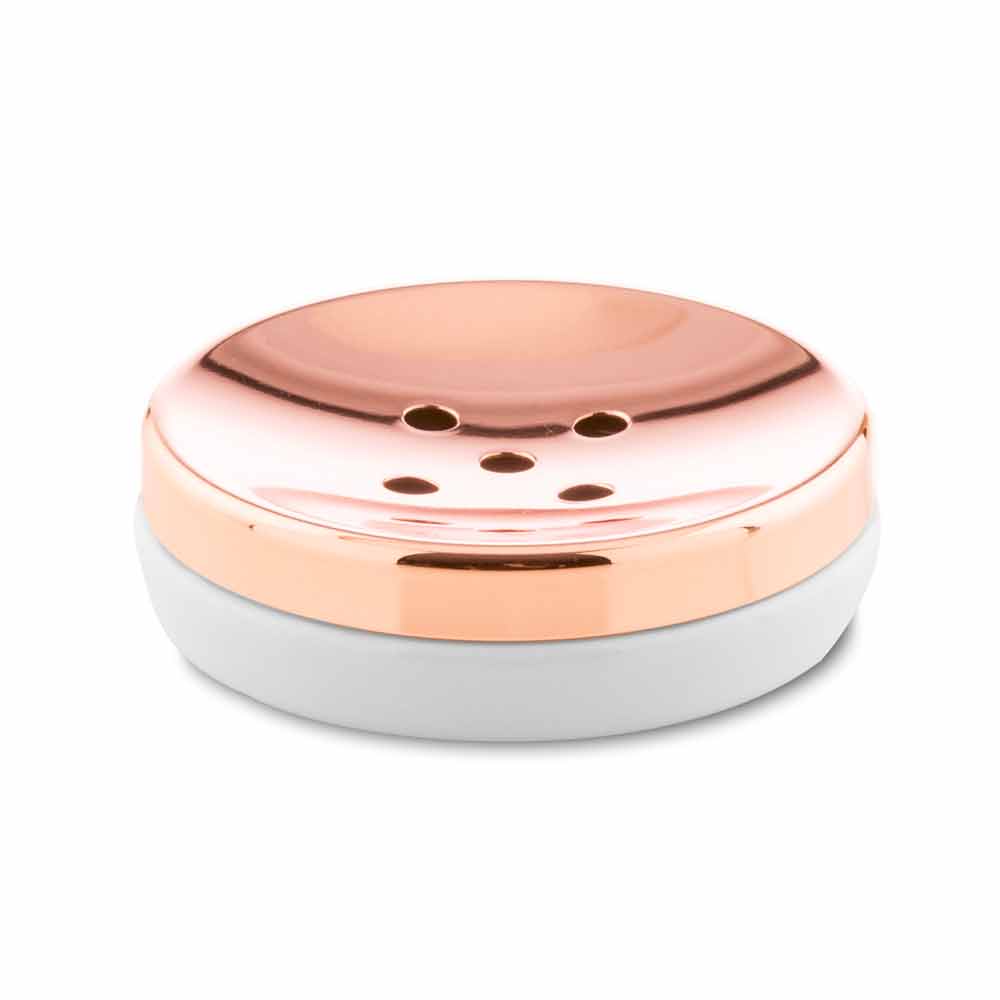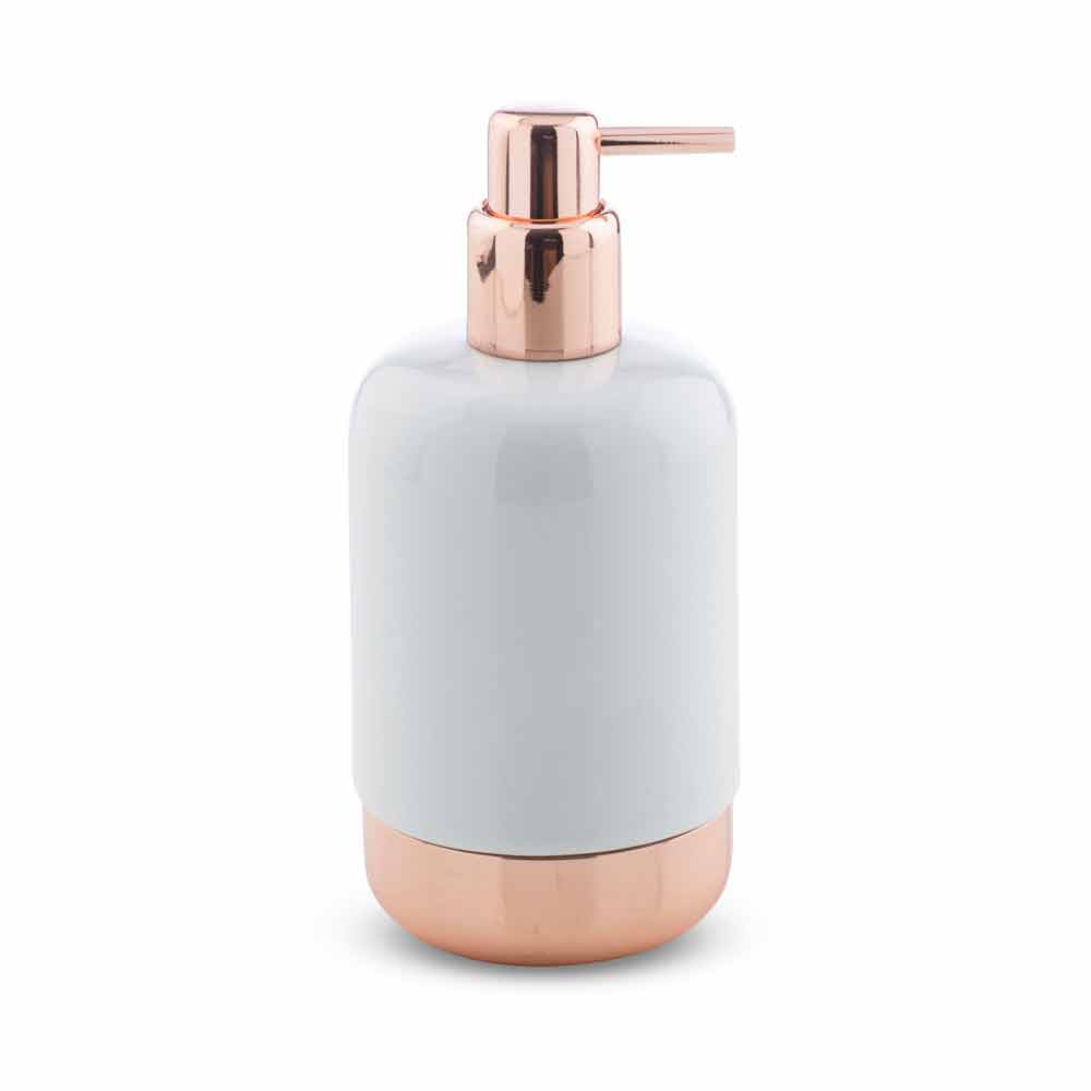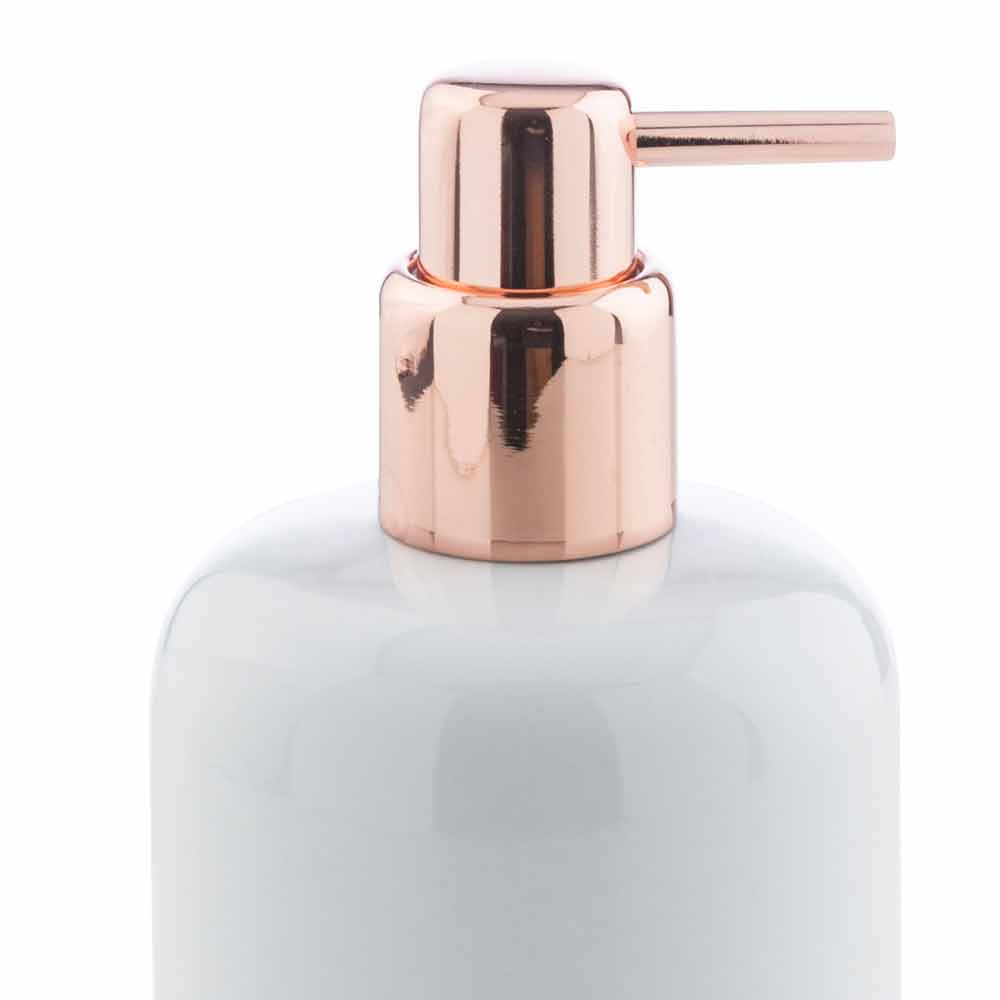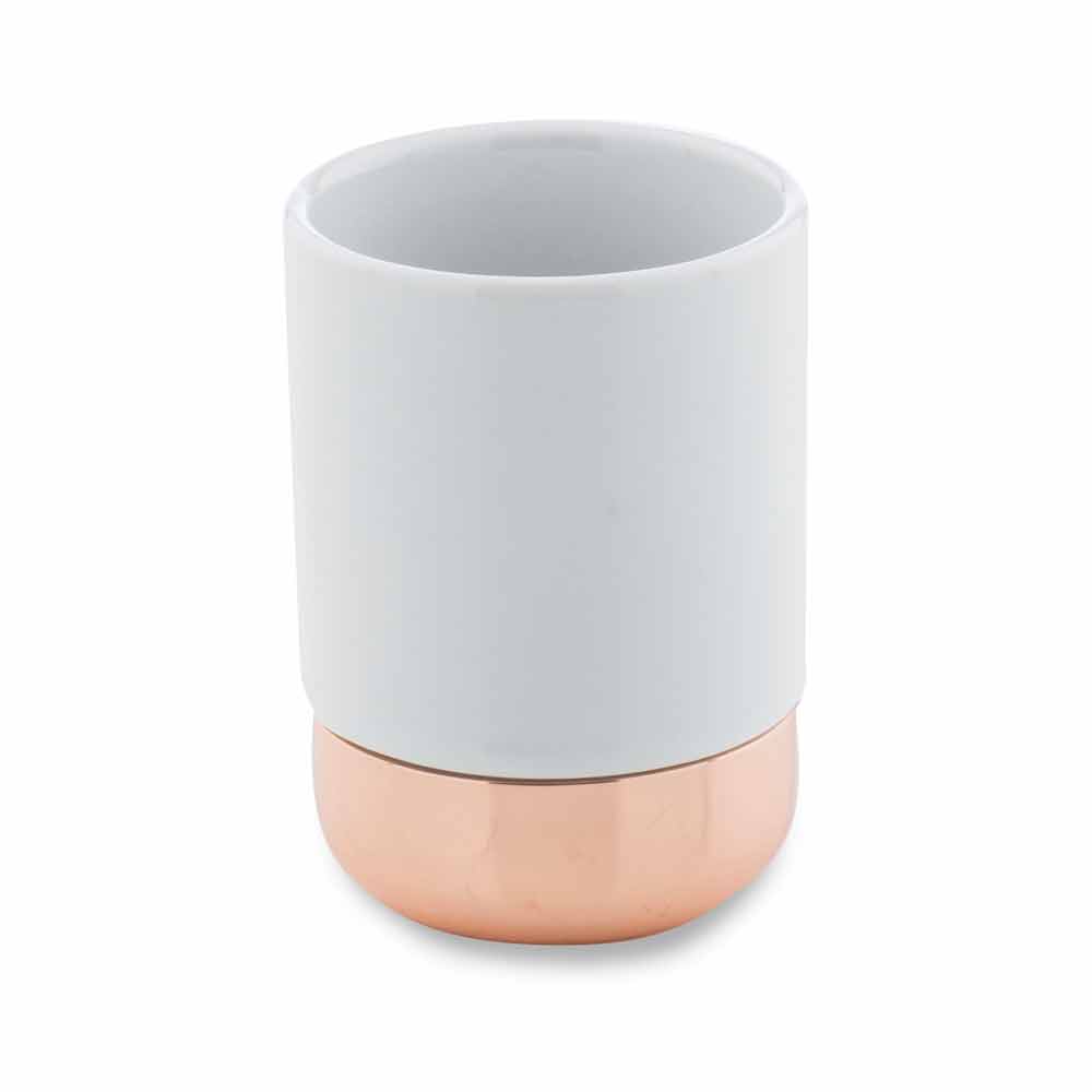 Freistehende Badaccessoires aus Keramik und poliertem Kupfer.