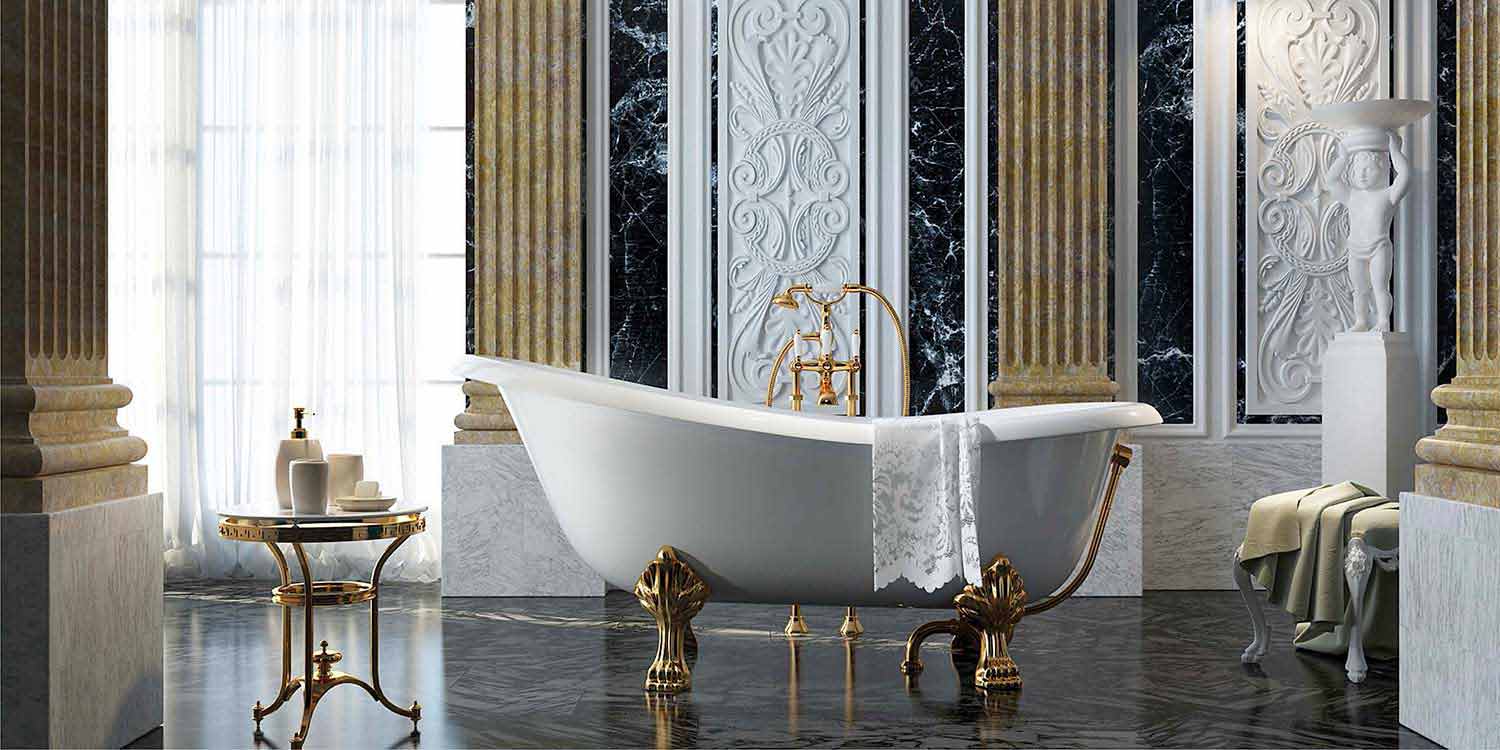 Fregona wird aus weißem verstärktem Harz mit goldfarbenen Metallfüßen geliefert. Seine freistehende Installation und sein klassisches und entschiedenes Design in Kombination mit alten und sorgfältigen Linien sind die perfekte Mischung für die Beleuchtung Ihres Badezimmers.