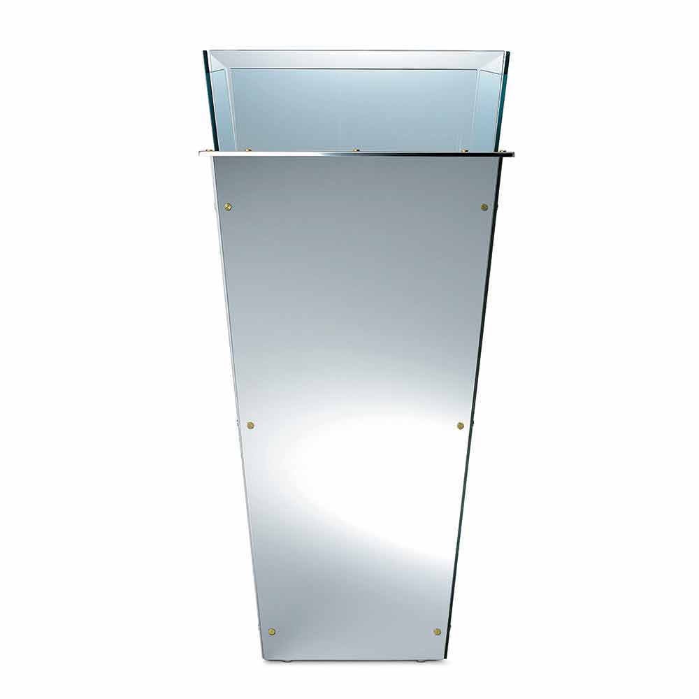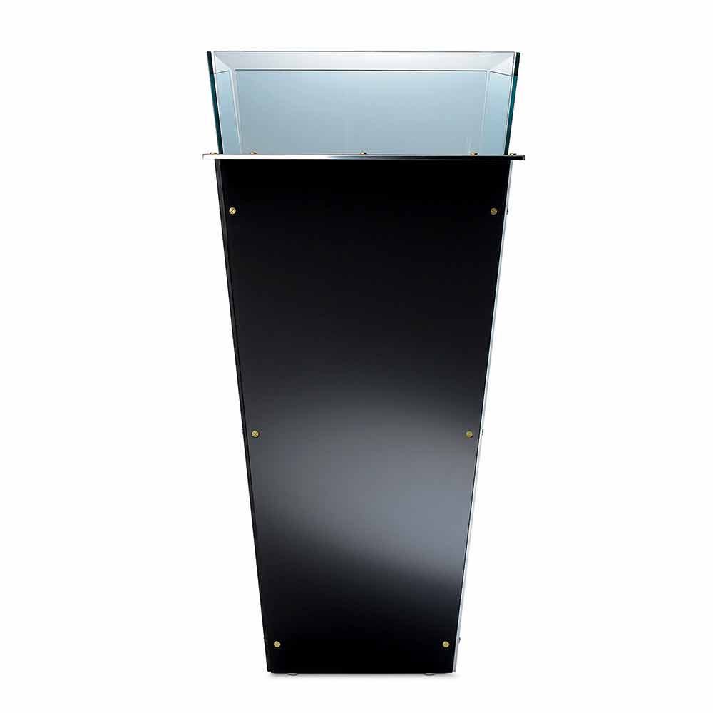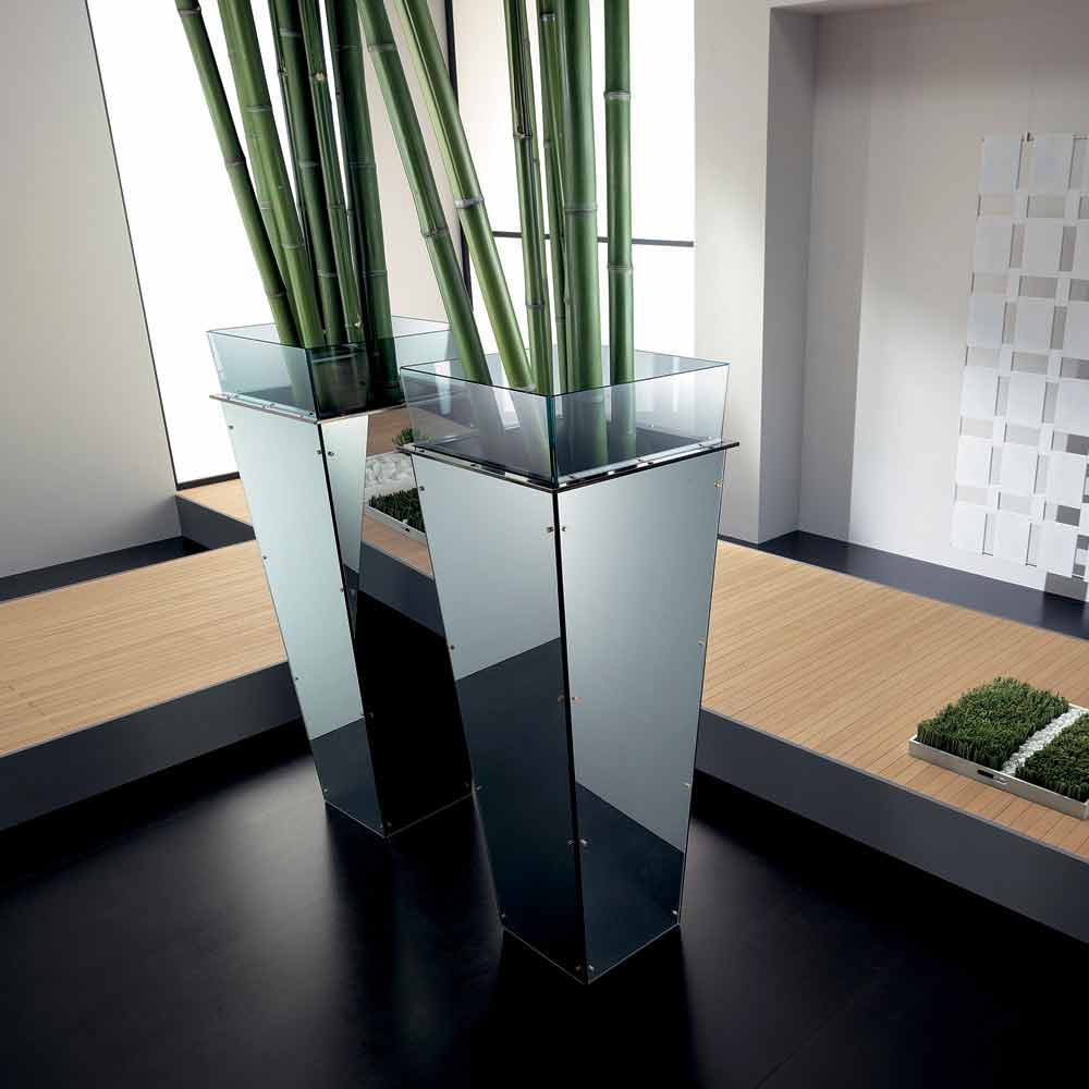 Diese in verschiedenen Größen erhältliche freistehende Vase zeichnet sich durch austauschbare Seitenteile in verschiedenen Ausführungen aus, wie zum Beispiel: schwarz lackiertes Glas, weiß lackiertes Glas, Spiegel oder Leder.