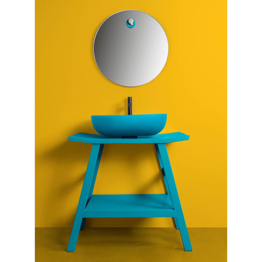 Freistehender Badezimmerschrank aus naturbelassenem blau lackiertem Teakholz , eine Farbe, die sich auf Ruhe und Gelassenheit bezieht und das Gefühl eines Eintauchens in das Blau des sardischen Meeres erzeugt, eine Emotion, die sich auf den überwältigenden Charme der Natur im Hinterland bezieht. Seine Struktur zeichnet sich durch die leicht geschwungene Form der Platte aus, die der Ästhetik des Produkts eine exklusive und raffinierte Note verleiht. Komplett mit 4 praktischen Handtuchhaken und funktionaler Ablagefläche .