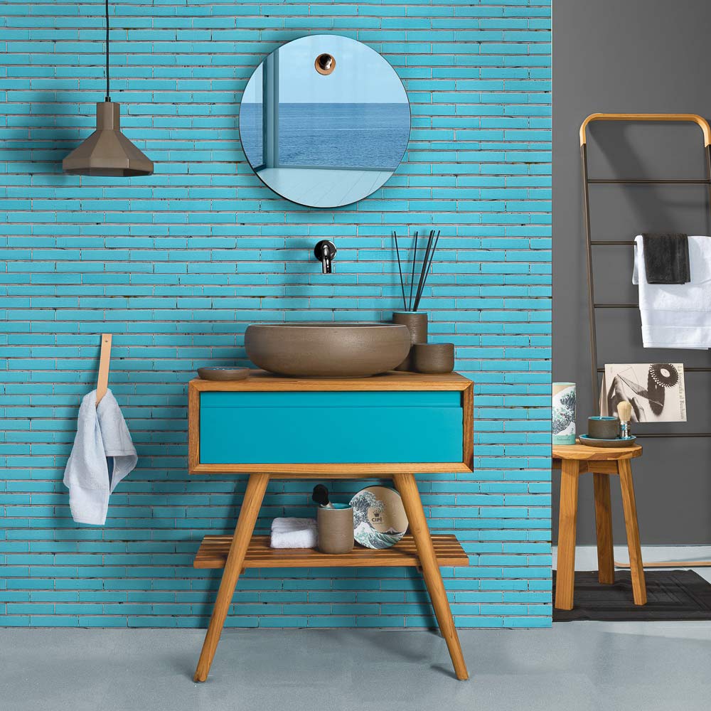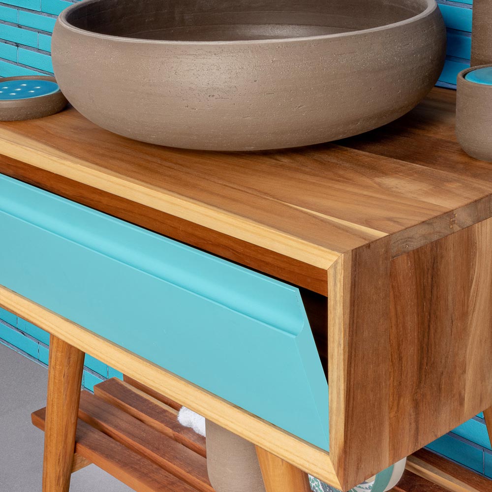 Bodenstehender Badezimmerschrank aus natürlichem wiedergewonnenem Teakholz mit Klappschublade aus blauem Mahagoniholz , eine Farbe, die sich auf die Ruhe und Gelassenheit bezieht, die mit natürlichen Elementen wie Wasser und Luft verbunden sind, und entspannende Effekte bietet, Emotionen, die auf den Charme der Beherrschung der Natur verweisen. Seine Struktur zeichnet sich durch einfache Formen und praktische Räume aus, die sich ideal für die elegante und funktionale Organisation des Badezimmerbereichs eignen, um ein originelles Ergebnis mit einer starken modernen Persönlichkeit zu erzielen.