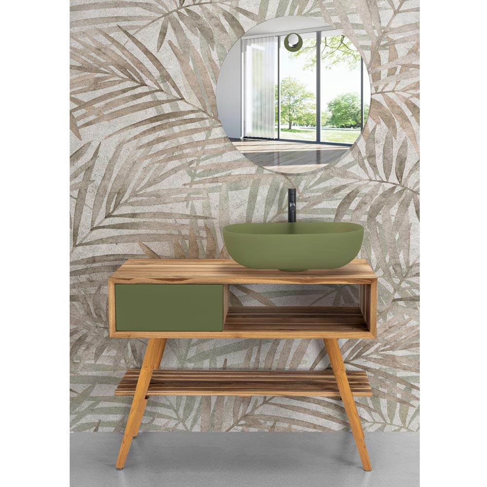 Bodenstehender Badezimmerschrank mit Struktur aus recyceltem natürlichem Teakholz mit Seitenschublade aus grünem Mahagoniholz , ein Farbton, der in jedem Detail an den Osten erinnert. Eine bewusst grafische Ästhetik, die noch mehr durch die Praktikabilität seiner Abmessungen verstärkt wird, die es perfekt für die Einrichtung kleiner Räume machen, die einen eleganten und funktionalen Protagonisten benötigen.
