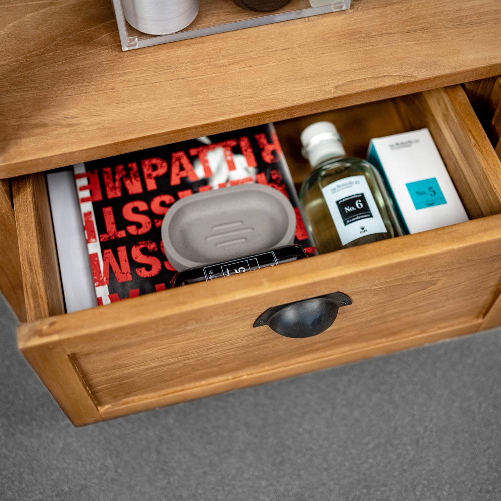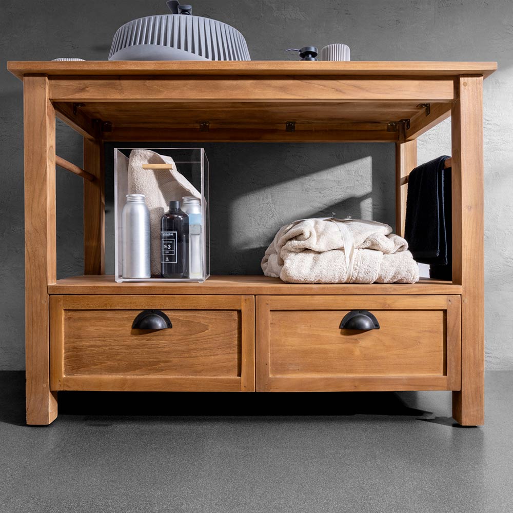 Dieser Badezimmerschrank ist ein elegantes Beispiel für Funktionalität und Stil und eignet sich ideal, um jeder Umgebung einen Hauch von Klasse zu verleihen. Dieses aus hochwertigem, massivem, recyceltem Teakholz gefertigte Möbelstück ist nicht nur ästhetisch ansprechend, sondern dank seines 100 % natürlichen Materials, das sorgfältig gewachst wurde, um Stärke und Haltbarkeit zu gewährleisten, auch eine nachhaltige Option. Er verfügt über zwei geräumige Schubladen an der Unterseite, die jeweils mit Griffen im Vintage-Design verziert sind, die dem Schrank einen einzigartigen Charakter verleihen. Die unbestreitbare Funktionalität wird durch zwei an den Seiten des Möbels angebrachte Handtuchhalter vervollständigt.