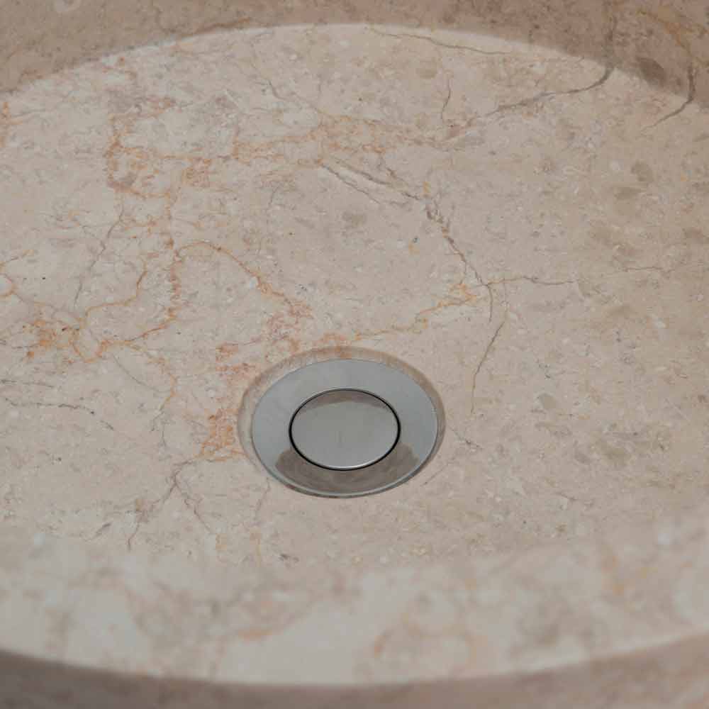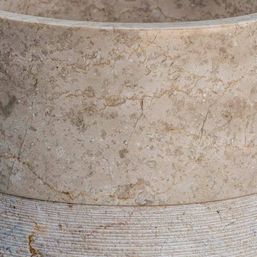 Freistehendes Marmorwaschbecken in Elfenbein- bis Cremetönen und warmen Farbtönen. Bestehend aus zwei Teilen, ist das erste "das Becken" sowohl außen als auch innen aus poliertem Marmor. Der zweite Teil ist die "Basis", die durch Verzieren des rohen Marmors mit einem Dreheffekt hergestellt wird. Die Art der Verarbeitung des Sockels kann zu Rissen oder Rissen im Marmor führen, die die Integrität oder Sicherheit der Spüle in keiner Weise beeinträchtigen. Solche Situationen gelten nicht als Produktfehler.