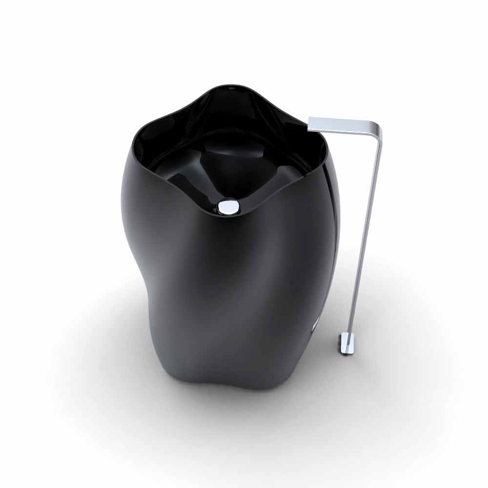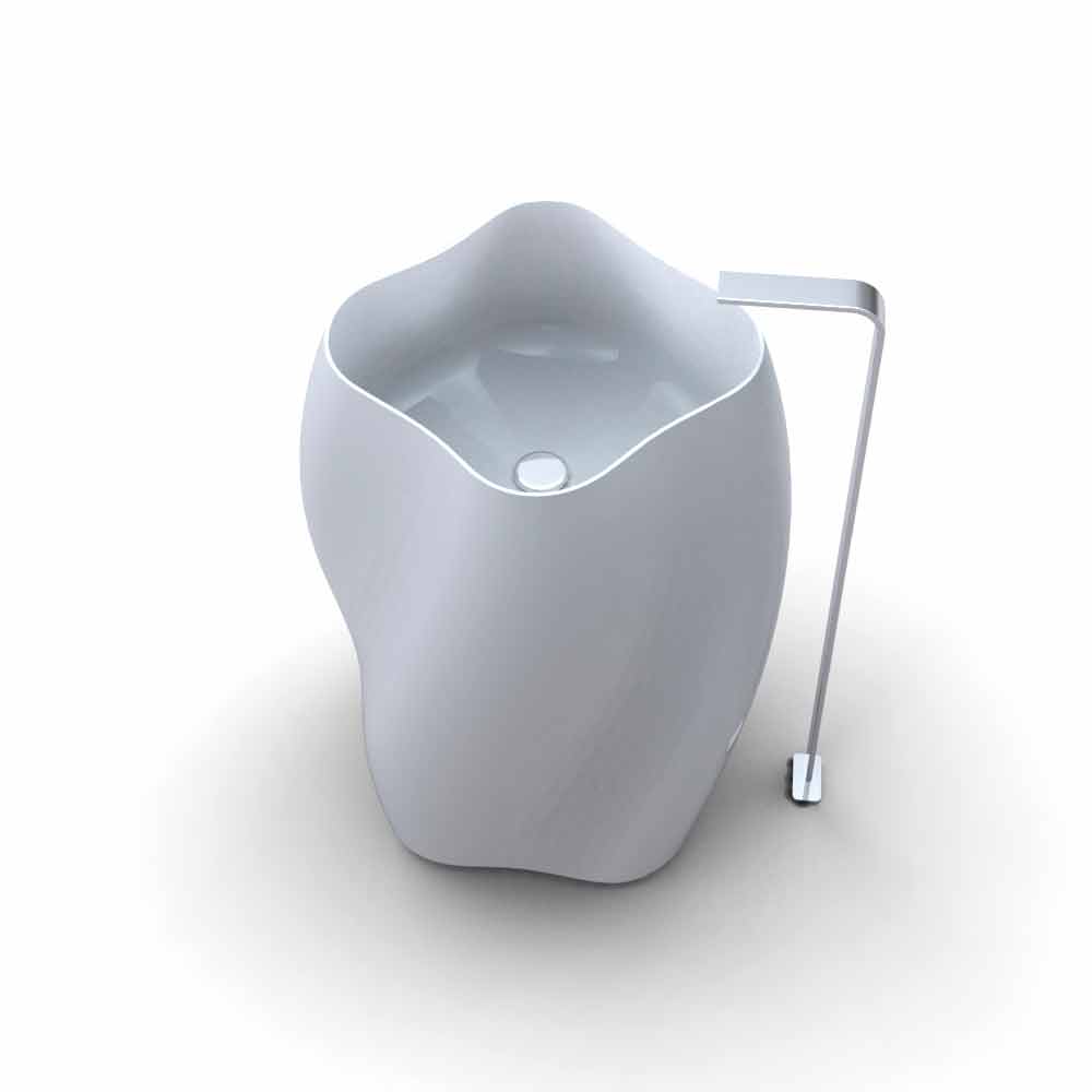 Freistehendes Waschbecken mit geschwungenen und organischen Formen aus Solid Surface; Seine Linien zeigen ein Profil, das an die Silhouette einer "exotischen" Blume erinnert. Neben dem „welligen“ Seitenprofil hat es als Charakteristika eine leicht „gedrehte“ Form, die nach oben hin schlank ist, um ein einzigartiges viereckiges Becken mit Lappen zu zeigen. Letztere stellt sich als weiteres Charakterisierungselement und geometrische Grundfigur dar, die die gesamte Komposition generiert. Die Sanitärkeramik hat auch eine gute Ergonomie, da sie recht rund ist und in zwei verschiedenen Farbvarianten erhältlich ist: Weiß (RAL9003) oder Schwarz (RAL9005).