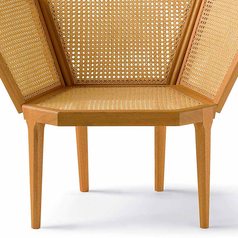 Stuhl in Dosen aus Fünfecken. Ein Klassiker der Möbel, der Holzstuhl mit Sitz in Wiener Stroh, der typisch für das frühe zwanzigste Jahrhundert ist, wird in einem futuristischen Look wieder aufgegriffen, wo traditionelle Verarbeitungstechniken mit Treue und Beherrschung übernommen werden, aber die geschwungenen und süßen Formen des ursprünglichen Modells verlassen Raum mit vereinfachten Linien und kristallisierten Formen, die sich im Raum vermehren.