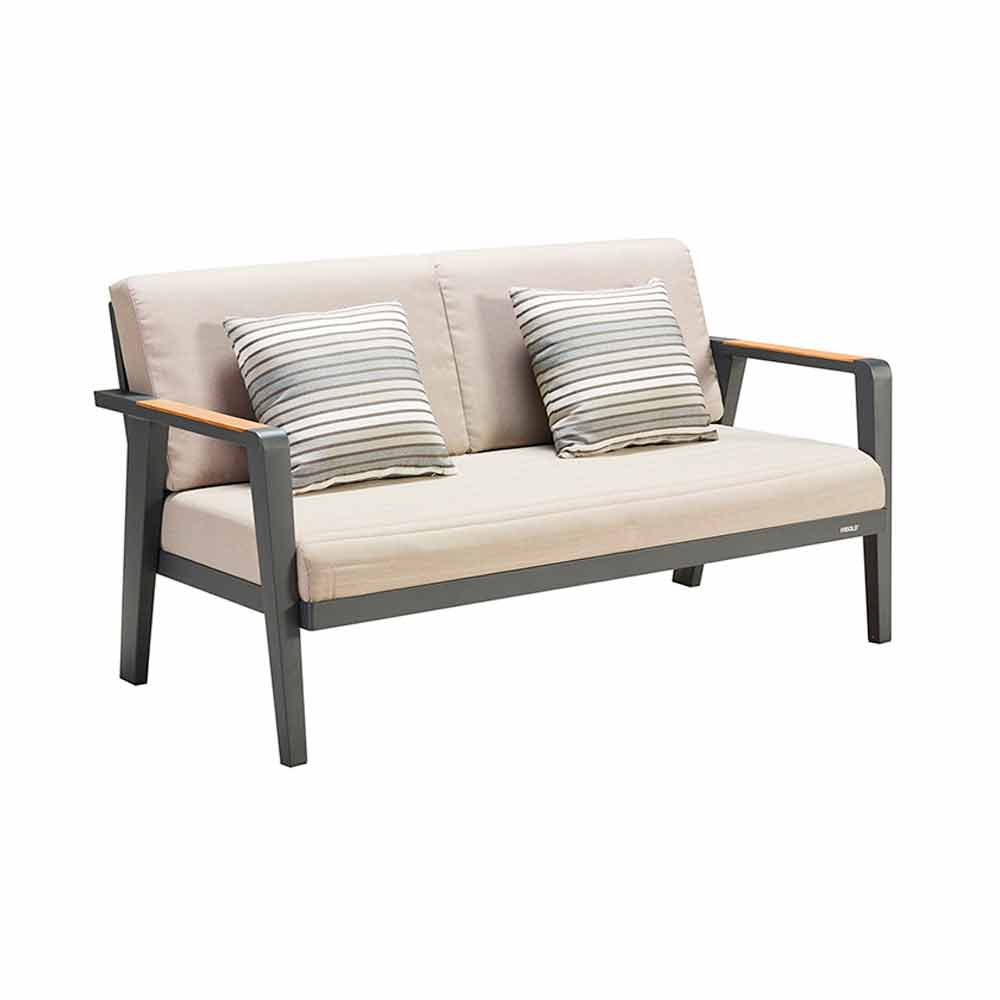 Gartenlounge mit 2-Sitzer-Sofa, 2 Sesseln und Couchtisch aus grauem Aluminium und Teakholz.