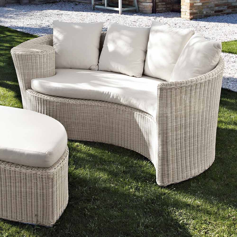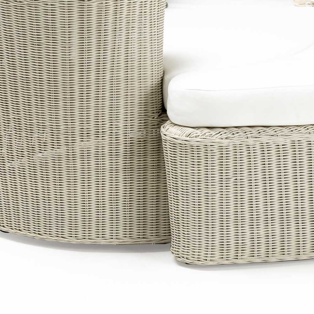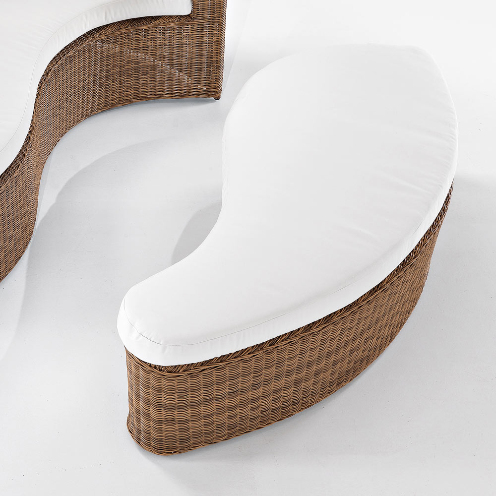 Diese Liege zeichnet sich durch ihr rundes Design und ihr Vollgeflecht aus. Ihre weichen und geschwungenen Volumen harmonieren perfekt mit der großen Sitzfläche, auf der man sich optimal entspannen kann. Die Liege Donna besteht aus zwei komplementären Elementen, die je nach Bedarf zu einer einzigen Chaiselounge oder zu zwei separaten Sitzplätzen zusammengefügt werden können.