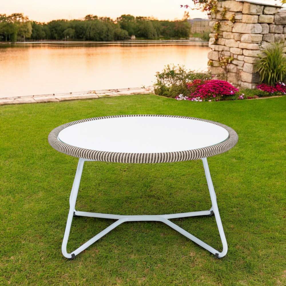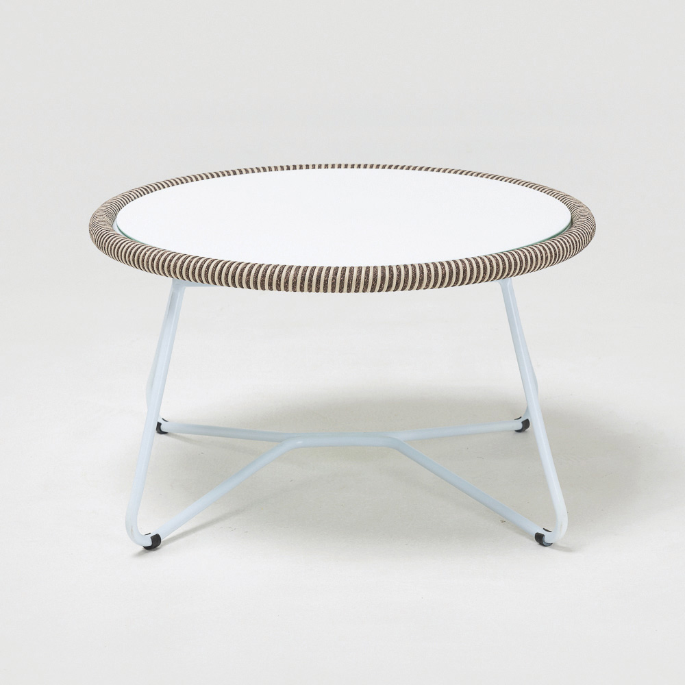 Der Couchtisch für den Außenbereich besteht aus einer Aluminiumstruktur, einem Geflecht aus Olefin/PP ROPE mit zweifarbiger perlweißer und cappuccinofarbener Oberfläche und einer weiß lackierten Glasplatte.