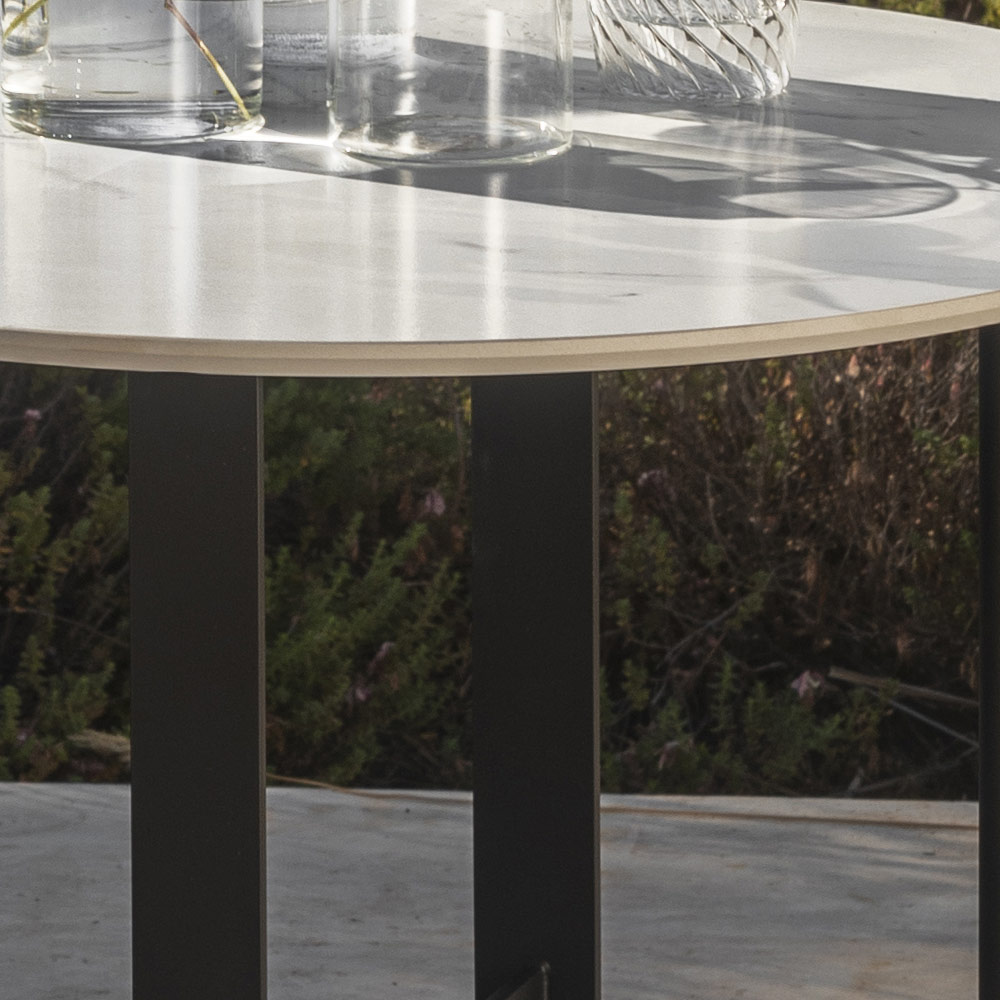 Der Outdoor-Couchtisch mit schwarz lackierter Stahlstruktur und Platte aus Feinsteinzeug mit weißer Marmoroptik wurde in Italien unter Verwendung von Materialien hergestellt, die eine hervorragende Widerstandsfähigkeit und Stabilität garantieren. Das unverwechselbare und avantgardistische Design , das die runde Form dieses Couchtisches unterstreicht, kann gleichzeitig eine starke szenische Wirkung erzeugen, die nützlich ist, wenn Sie Außenumgebungen beleuchten möchten, die eine Einrichtungslösung mit starker Persönlichkeit benötigen.