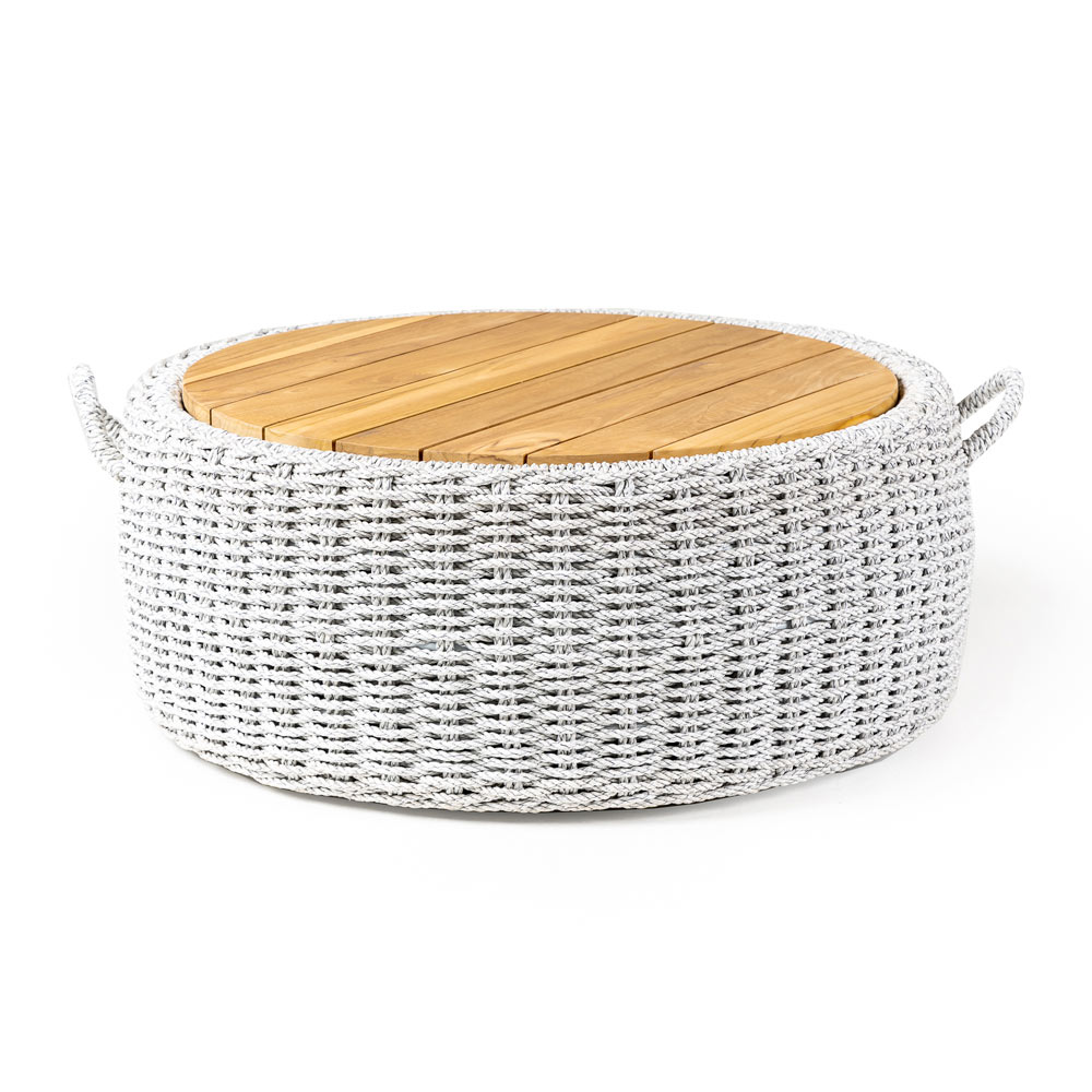 Dieser Outdoor-Couchtisch besteht aus einer inneren Struktur aus epoxy-pulverbeschichtetem Aluminium Gestell mit Basis aus Teakholz und handgeflochtenem VRO-Seil-Einsatz. Diese Kollektion verbindet die Schönheit des Teakholzes mit der handwerklichen Weisheit des Webens.