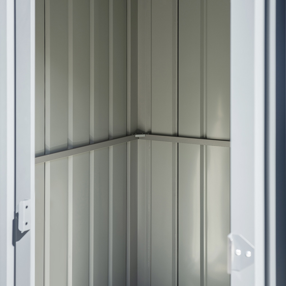 Dieser Gartenschuppen ist so konzipiert, dass er eine effiziente und stilvolle Lösung für die Lagerung im Freien bietet. Es besteht aus hochwertigem verzinktem Blech, ist korrosionsbeständig und gewährleistet Haltbarkeit und Schutz für Ihre Werkzeuge und Geräte.