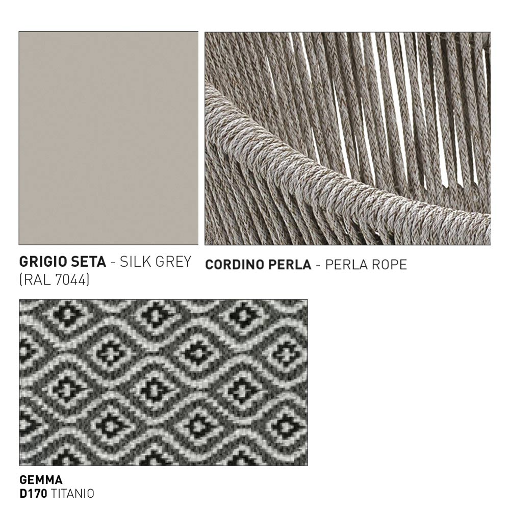 Gartenhocker bestehend aus einem pulverbeschichteten Aluminiumrahmen mit seidengrauem Finish, handgewebter Faser mit Perlmutt-Finish und Sitzfläche mit Polsterung . Ein Möbelstück für Außen- oder Innenräume, das den Komfort und Stil der Umgebung für ein einladendes Ergebnis und eine zeitgemäße Ästhetik vervollständigt.