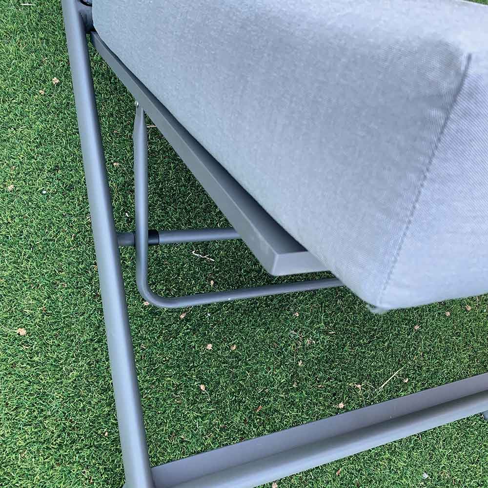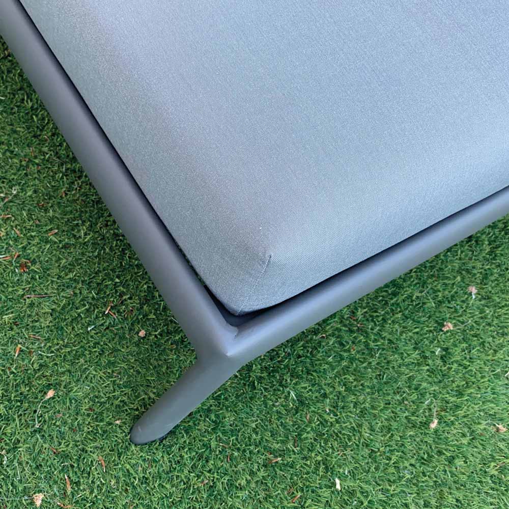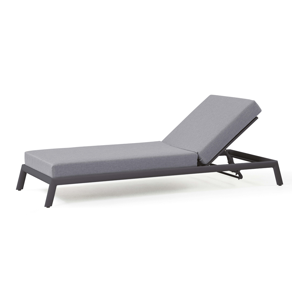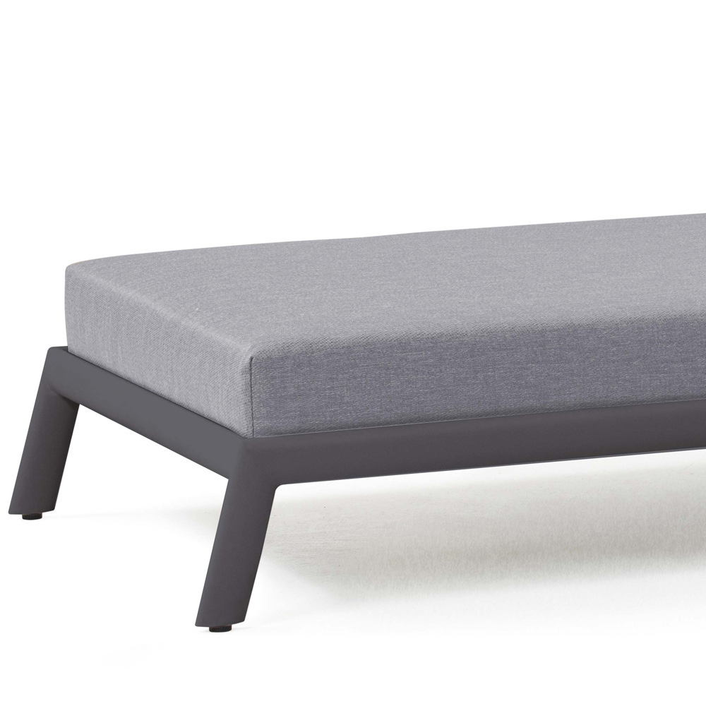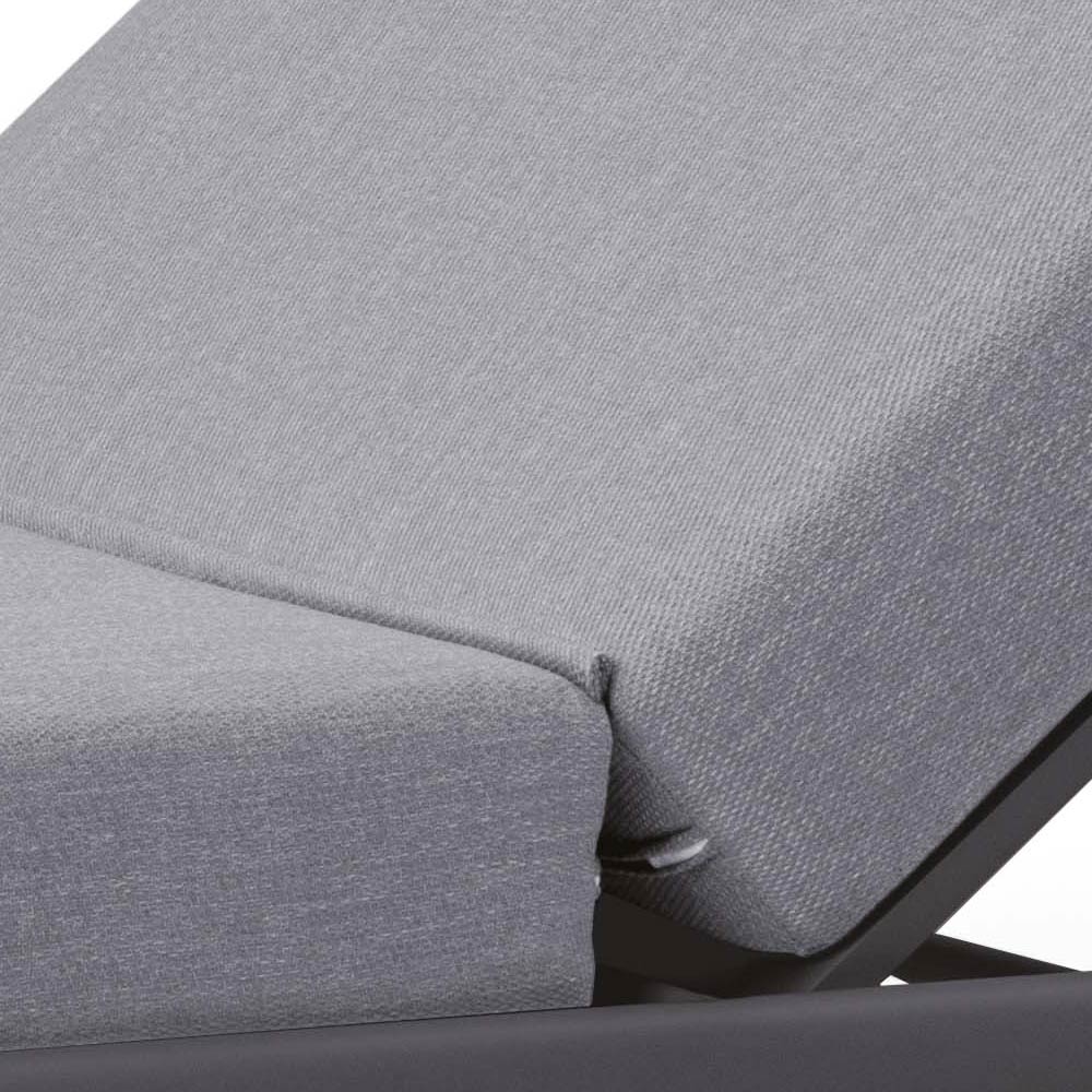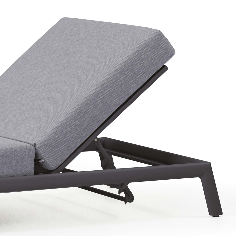 Garten-Chaiselongue mit Innenstruktur aus anthrazitfarben lackiertem Aluminium mit schnell trocknendem Schaum aus Gummi und himmelgrauem Schirmstoffbezug.