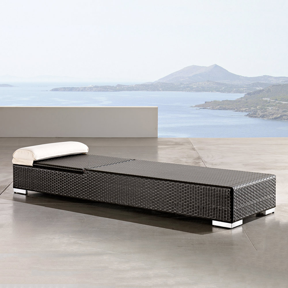 Die Sonnenliege gehört zu einer Kollektion, die Komfort und essentielle Formen kombiniert. Die hochwertigen Polyrattan-Fasern werden handgeflochten auf die massiven Aluminium-Rohrrahmen aufgetragen und garantieren maximale Widerstandsfähigkeit gegen Witterungseinflüsse wie Regen, UV-Strahlen, Salz und sogar extreme Wetterbedingungen.