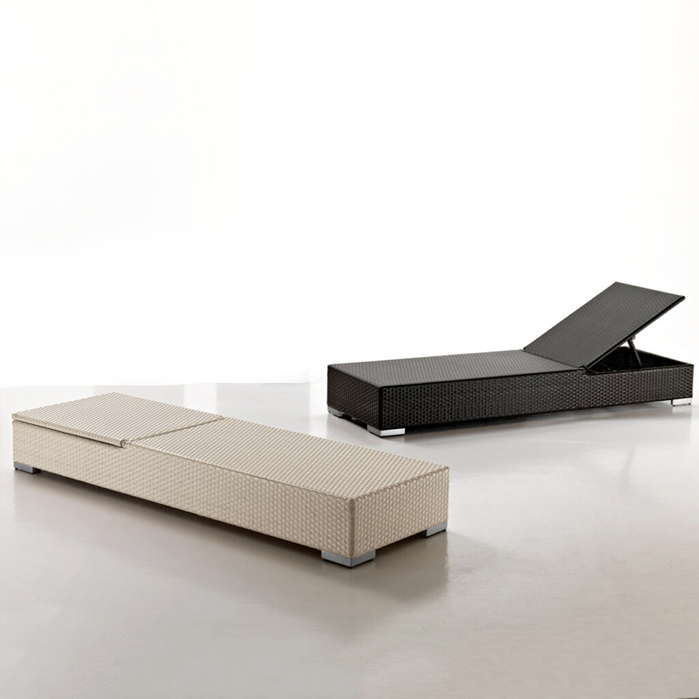 Liege für den Außenbereich aus rohrförmigem Aluminium und Polyrattan mit klaren und essentiellen Linien, die es erlauben, nie aus der Mode zu kommen, zusammen mit der hohen Qualität der Materialien, aus denen sie besteht. Die Rückenlehne kann für maximalen Komfort in verschiedene Positionen verstellt werden und passt sich jedem Bedürfnis an.