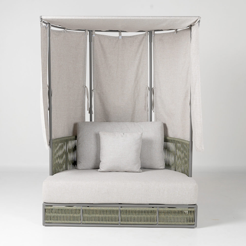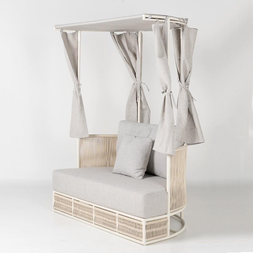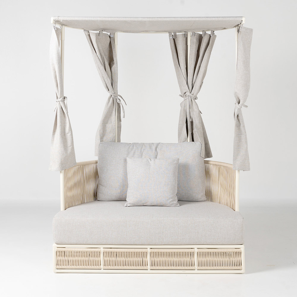 Die weichen, großzügigen Kissen in einem edlen Hellgrau verleihen dem Tagesbett eine natürliche, zeitlose Eleganz. Die neutrale Farbe harmoniert perfekt mit jeder Outdoor-Umgebung und schafft eine entspannte, helle und moderne Atmosphäre.