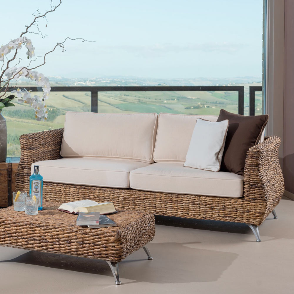 Das Wohnzimmer gehört zu einer ganzen Kollektion, die sich durch ihre modernen Töne sowohl im Design der Sitze als auch im Detail der Aluminium Füße auszeichnet. Gleichzeitig wird sie jedoch durch die Wärme des natürlichen Geflechts belebt, das handgefertigt aus einem raffinierten natürlichen Bananengeflecht ist.