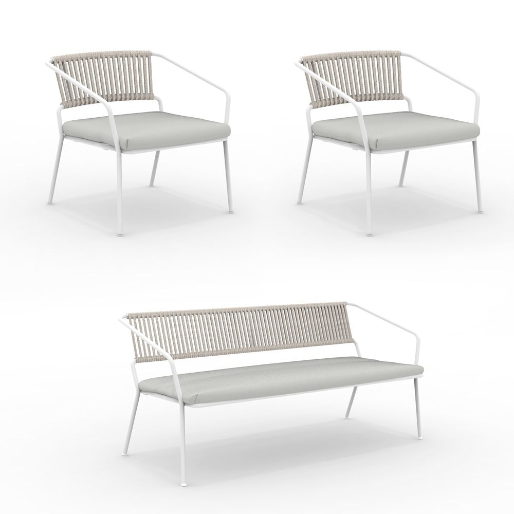 wasserdichte und UV-beständige Polsterstoff ergänzt die Struktur perfekt und bietet weiche und einladende Sitzgelegenheiten, ohne dabei auf Stil zu verzichten. Ob Sie Ihren Morgenkaffee genießen oder den Sonnenuntergang betrachten, diese Lounge ist der ideale Begleiter für jeden Moment der Ruhe und verbindet mühelos die Schönheit