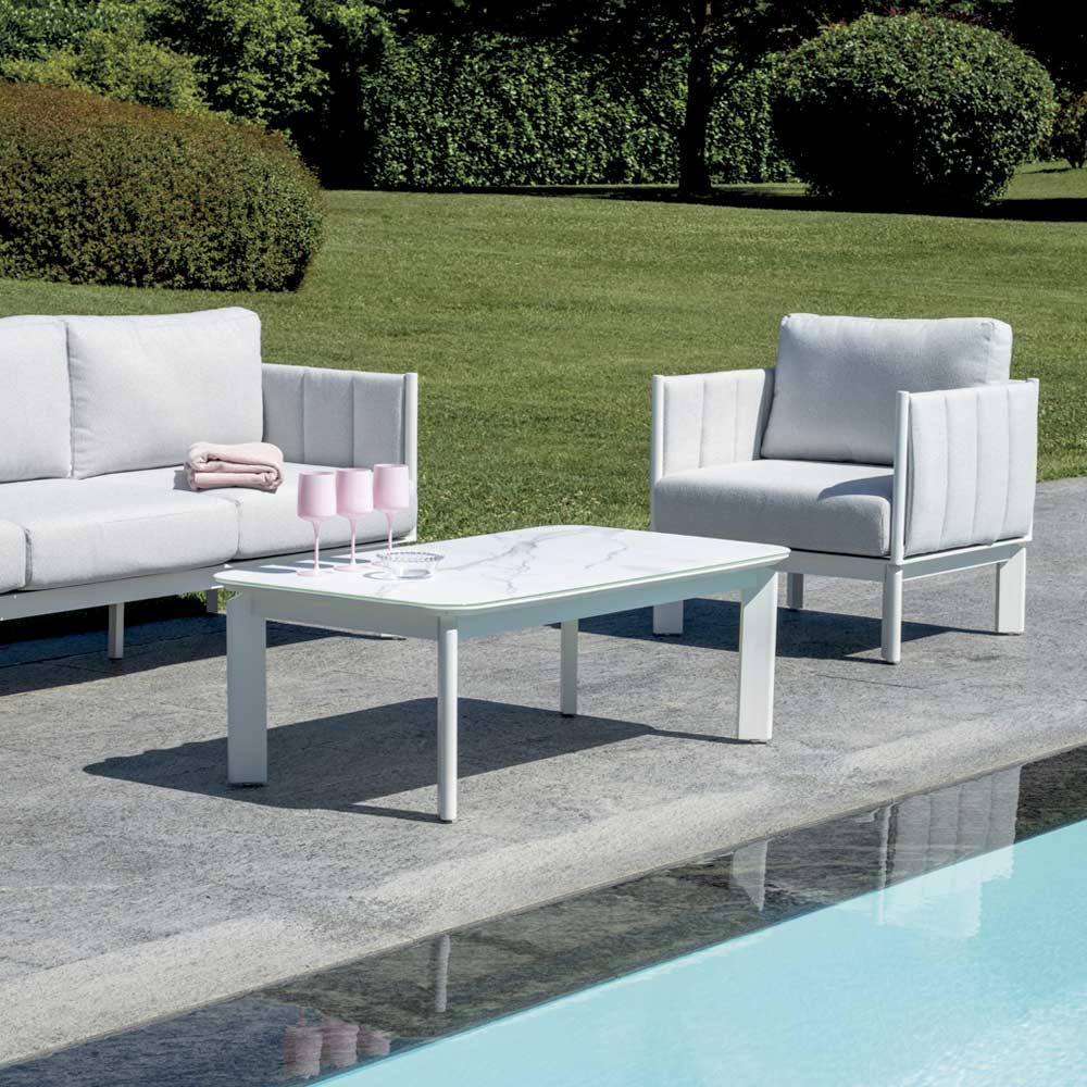 Perfekt für alle, die sich ein helles, elegantes und komfortables Wohnzimmer im Freien wünschen, das Ästhetik und Funktionalität für Momente purer Entspannung im Freien vereint.