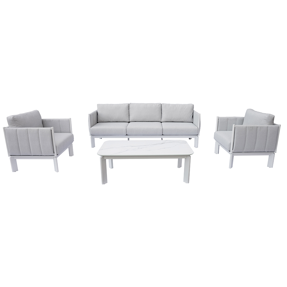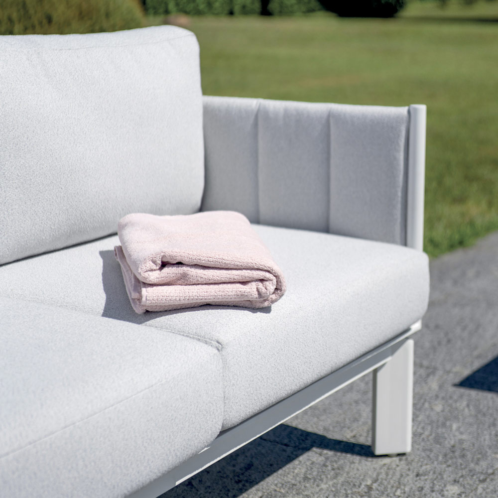 Das weiße Aluminiumgestell sorgt für Helligkeit und Langlebigkeit, während die hellgraue Stoffpolsterung für Gemütlichkeit und Komfort sorgt. Die abnehmbaren Kissenbezüge , ebenfalls in Hellgrau, ermöglichen eine schnelle und einfache Reinigung und halten das Wohnzimmer stets ordentlich und makellos.