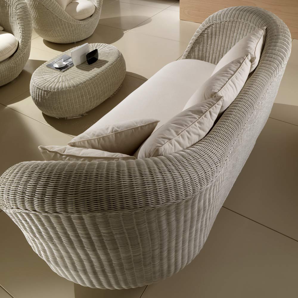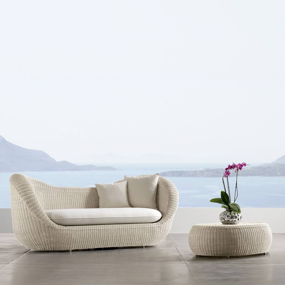 Diese Outdoor-Lounge zeichnet sich durch ihr stetiges und zeitloses Design , die abgerundeten Linien und die Raffinesse des Geflechts aus, das von den besten Handwerkern der Welt handgefertigt wird. Das Gestell besteht aus pulverbeschichtetem Aluminium, auf dem die höchste Qualität der Marke Rehau Polyrattan von Hand geflochten wird.