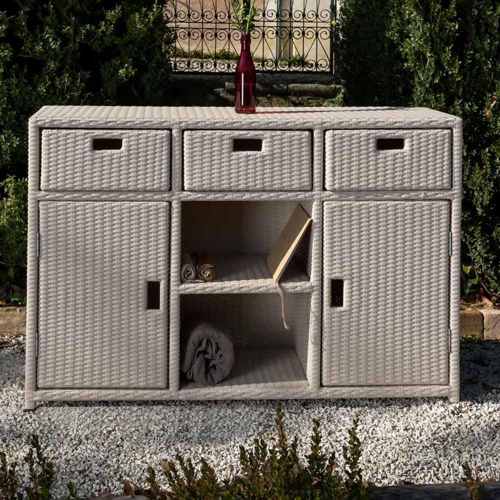 , die aus funktionellen Objekten besteht, mit denen man dank der sorgfältigen Auswahl der Produktionsmaterialien, die witterungsbeständig und speziell für eine lange Lebensdauer konzipiert sind, den Außenbereich sorgenfrei dekorieren kann. Die hochwertigen Polyrattan-Fasern werden
