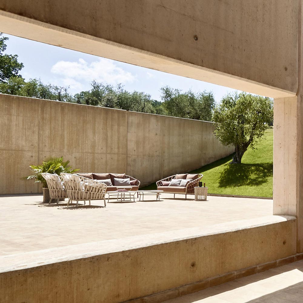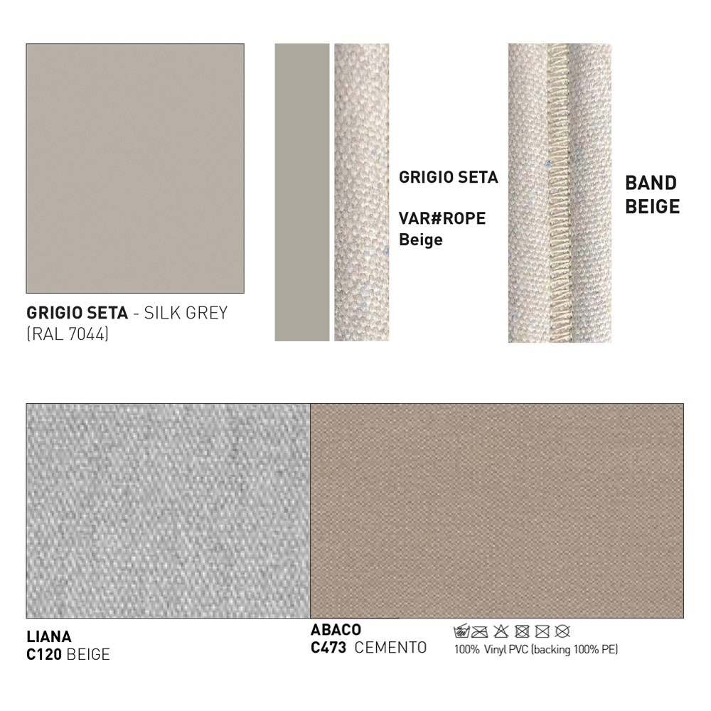 - Beine und Struktur in Seidengrau, Webstoff in Beige, Sitzkissen in Beige, Rückenkissen in Beige und Abakus aus Beton;