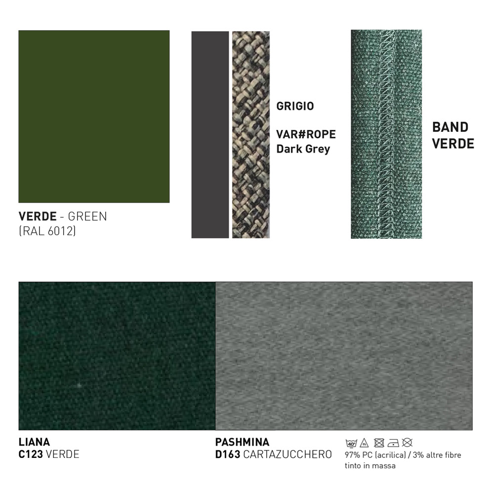 - grünes Bein, graue Struktur, grünes Geflecht und grüner Sitz, grüne Rückenkissen und Zuckerpapier.