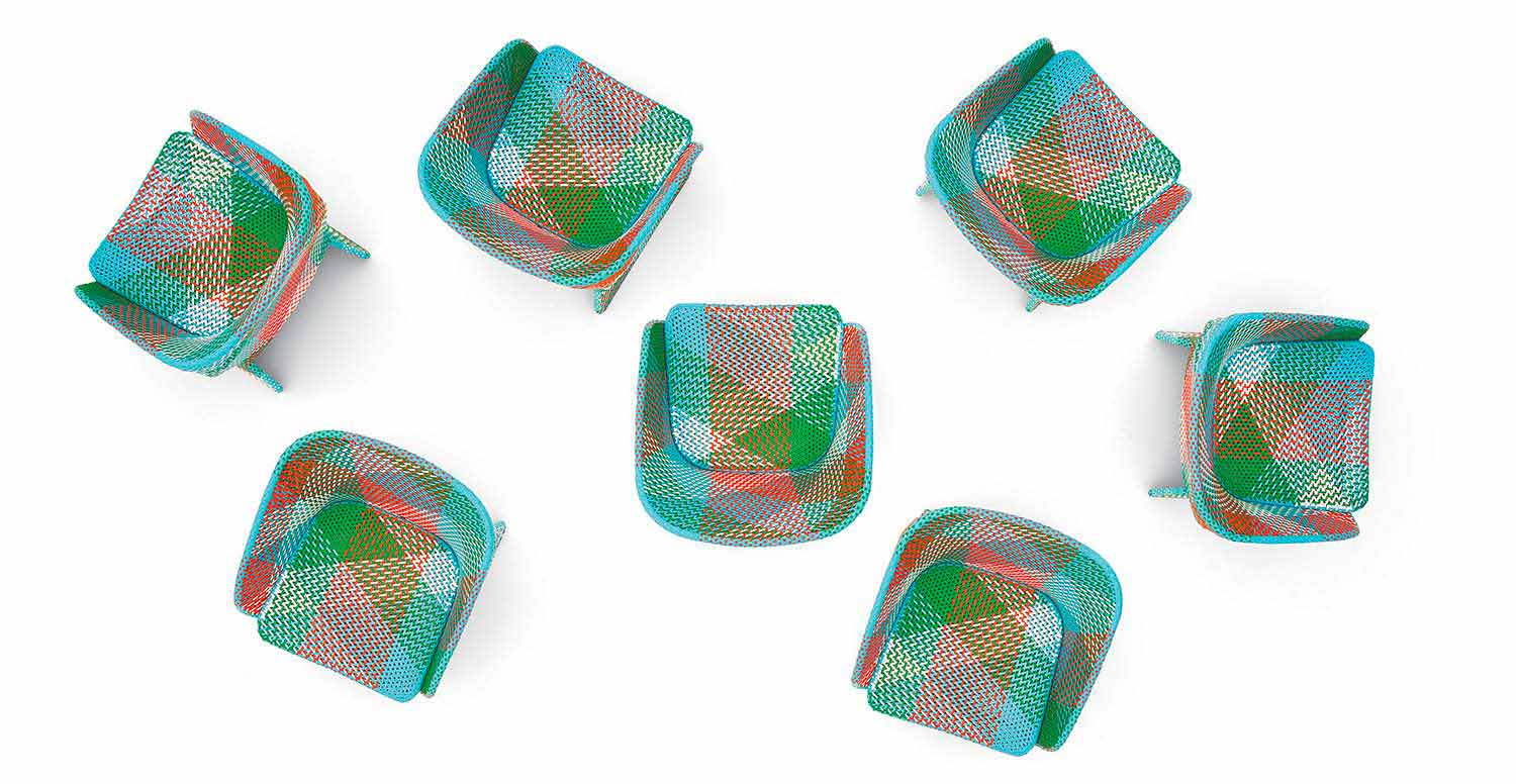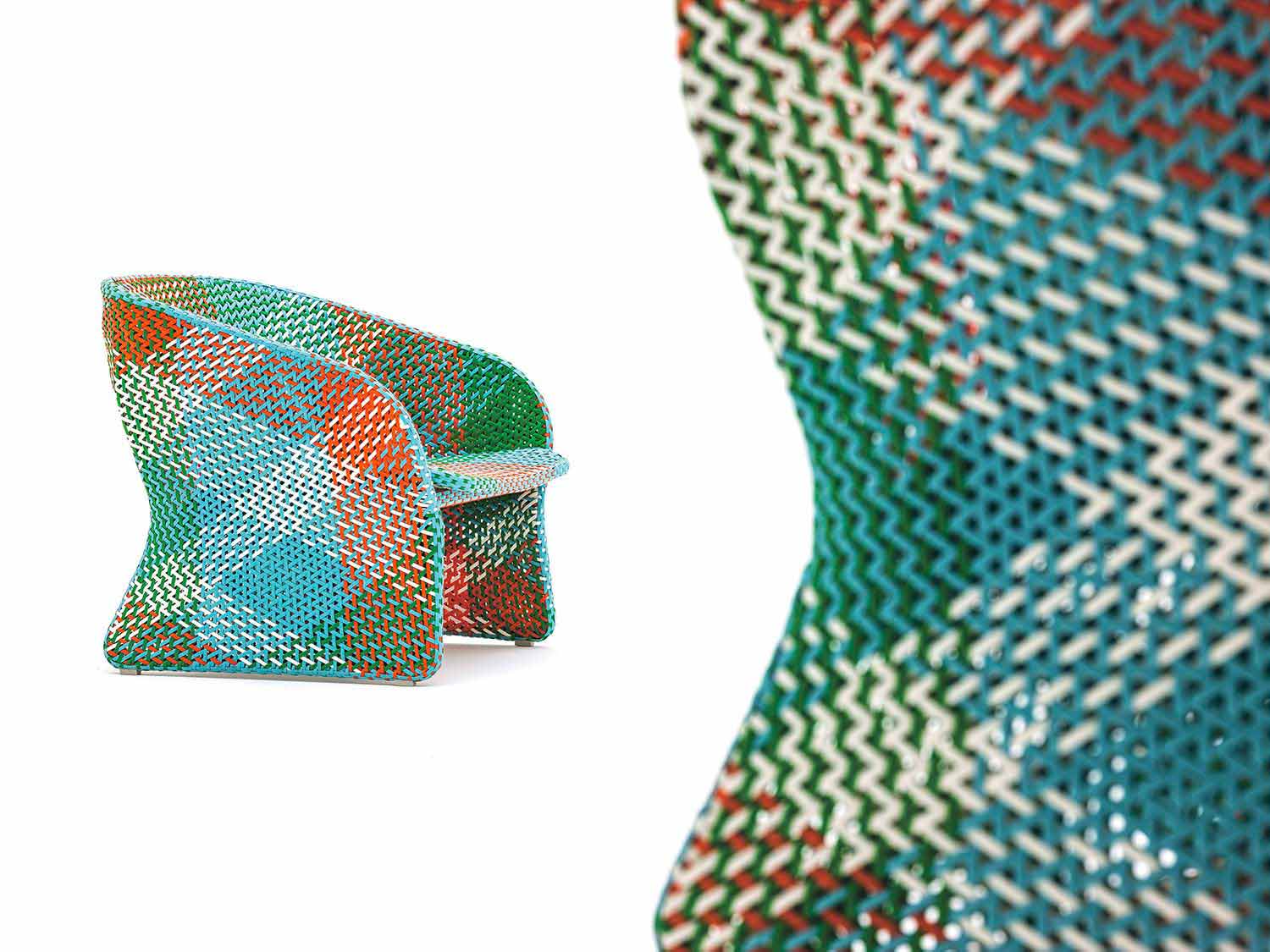 Vier verschiedenfarbige Kunstfaserbänder kreuzen sich, um das Weben des Maat-Sessels zu formen. Das Weben erfolgt von Hand um eine pulverbeschichtete Aluminiumstruktur.
