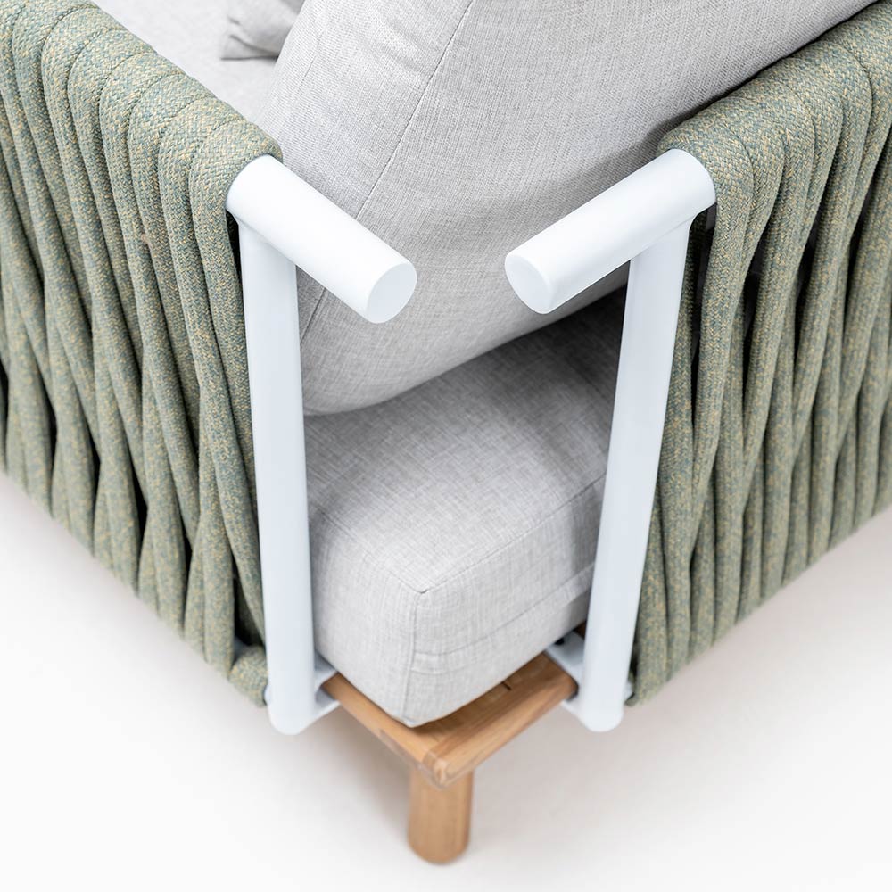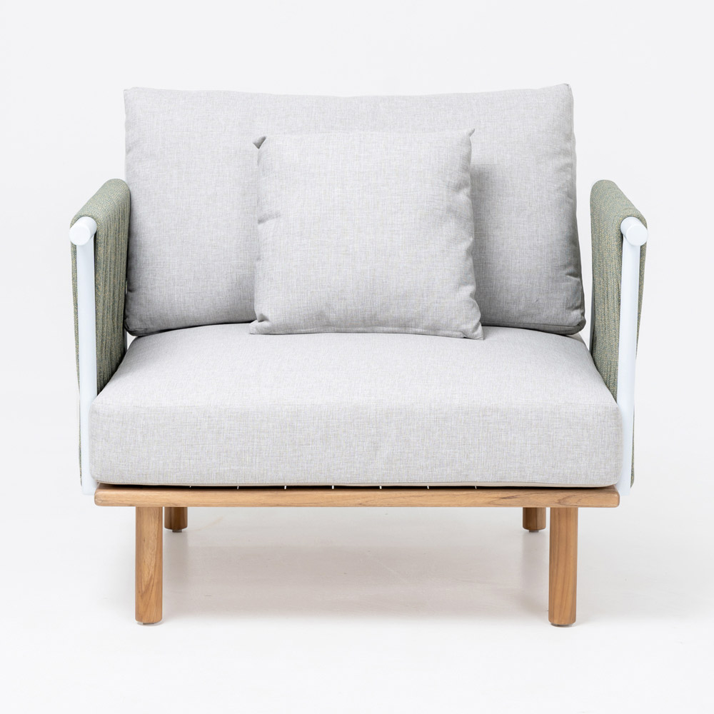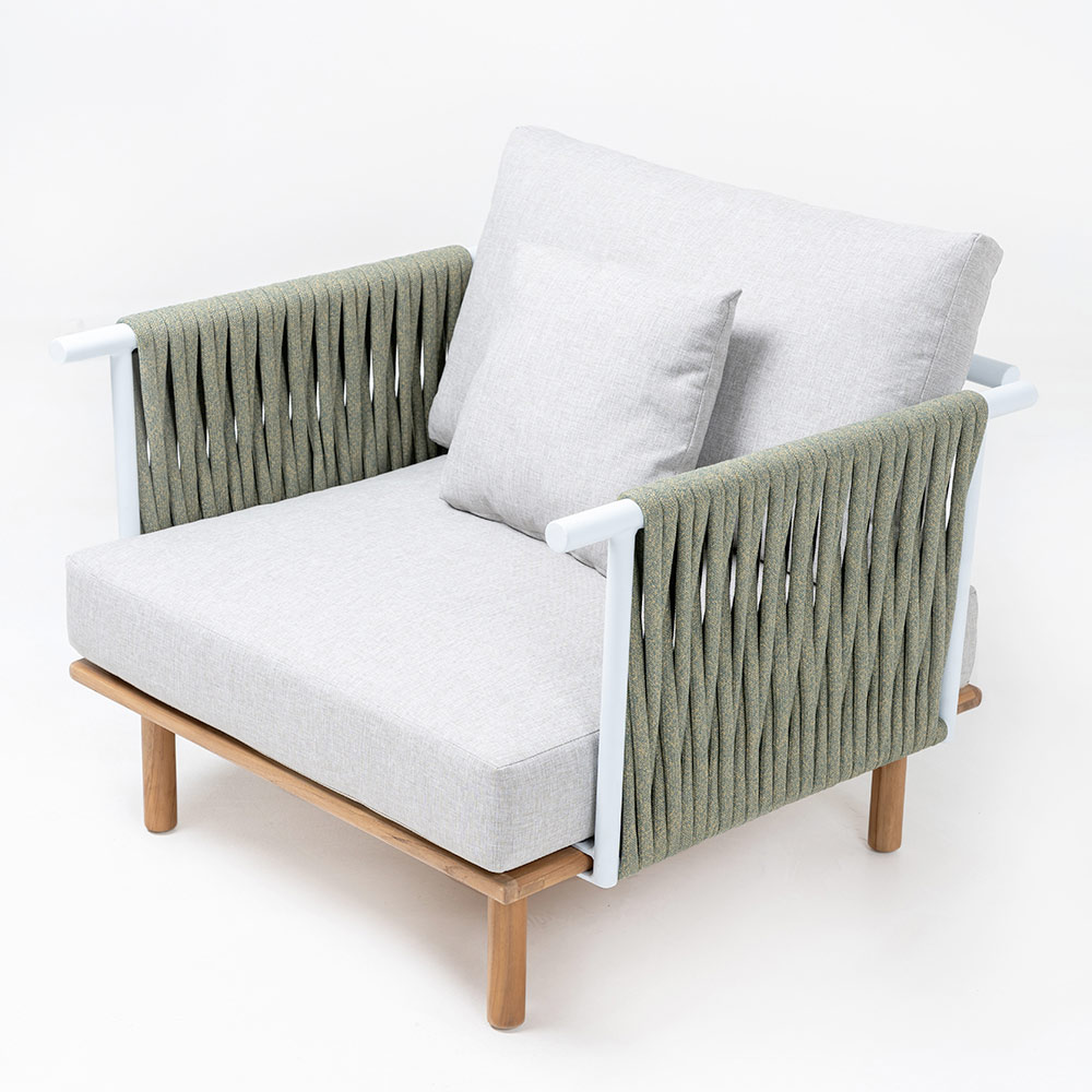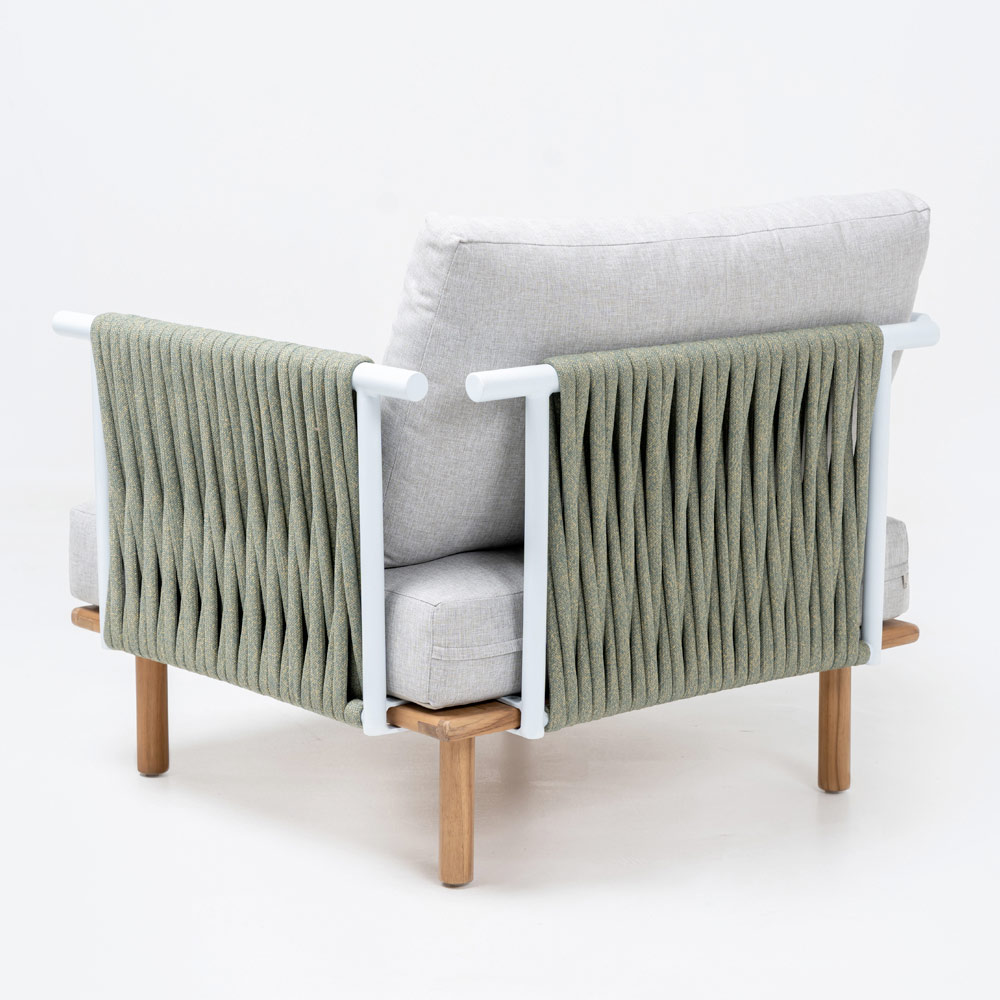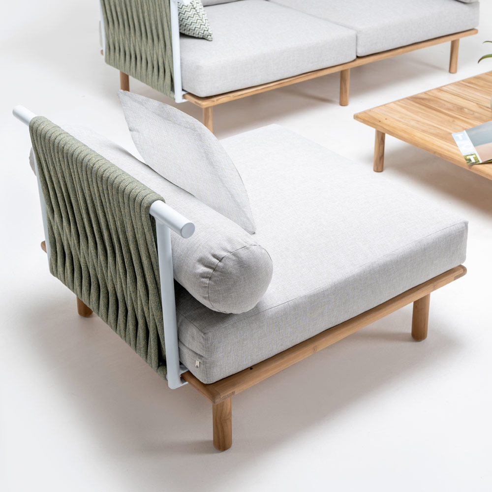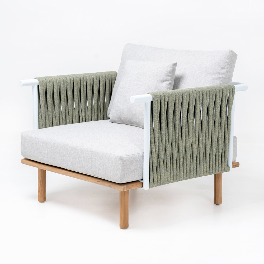 Gartensessel aus Teakholz, Rückenlehnen aus Aluminium und Olefin/PP ROPE-Geflecht und Kissen