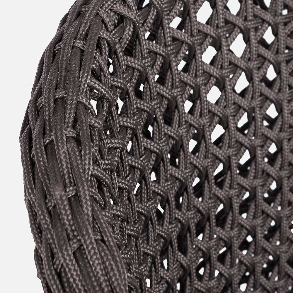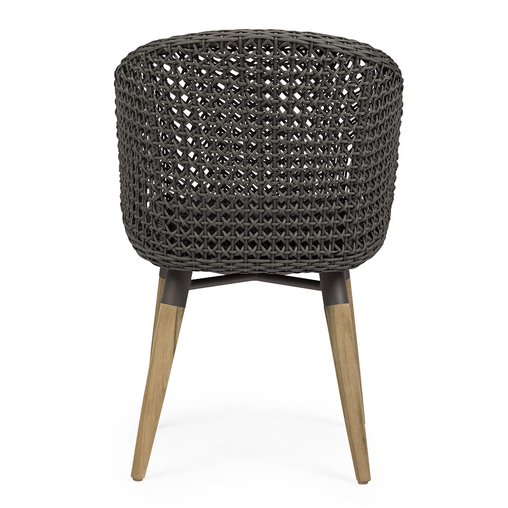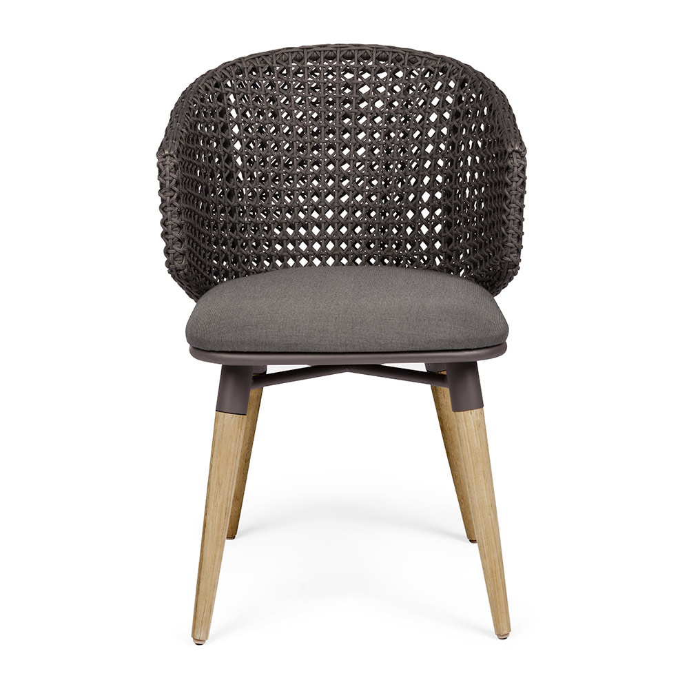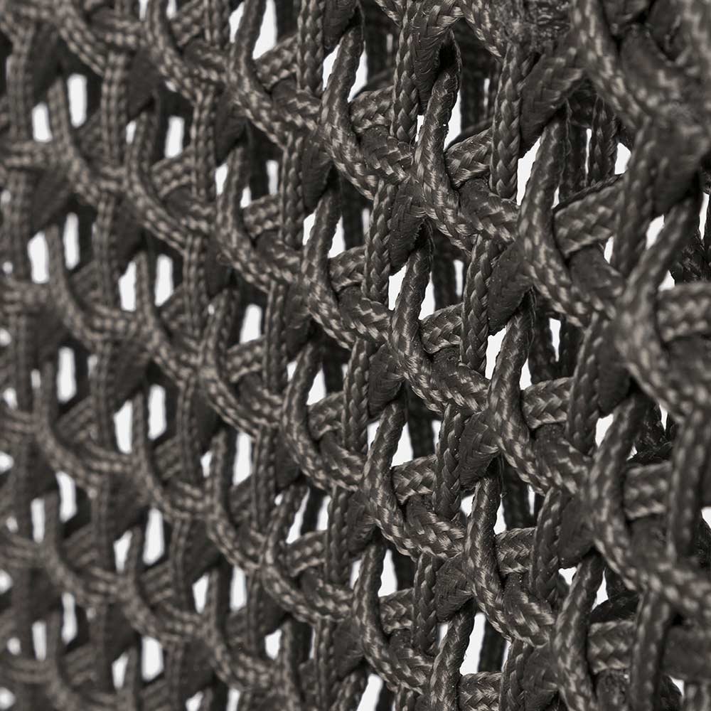 Pulverbeschichtete (Polyester) Aluminiumstruktur (Guss). Teak Beine - SVLK (zertifiziertem Holz aus nachhaltiger Forstwirtschaft) mit rustikalem Abgang. Gewebt für den Außenbereich in Seilen (Polypropylen), wasserabweisend und UV-beständig.
