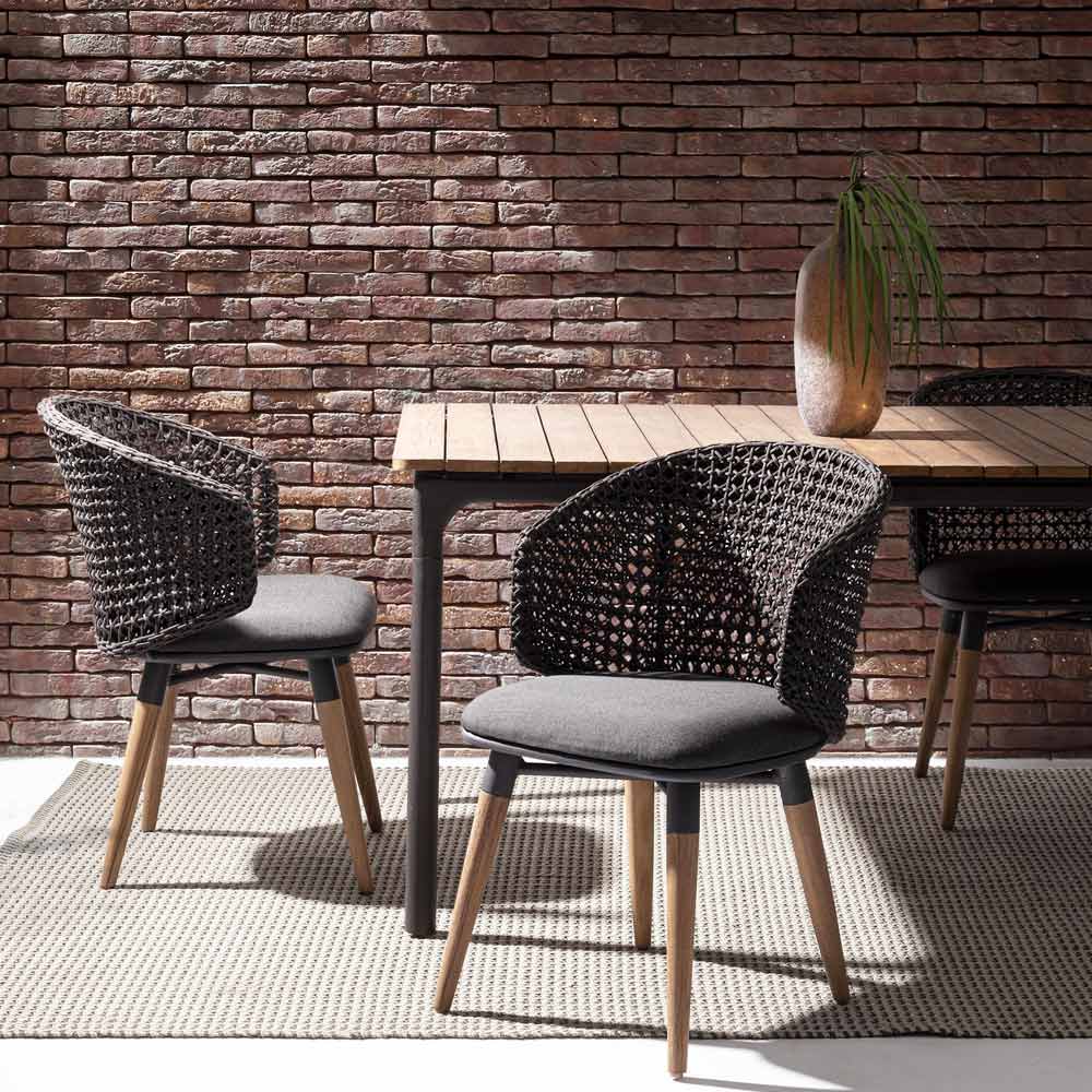 Hochwertiger Outdoor-Sessel aus Seil und Stoff mit Beinen aus Teakholz.