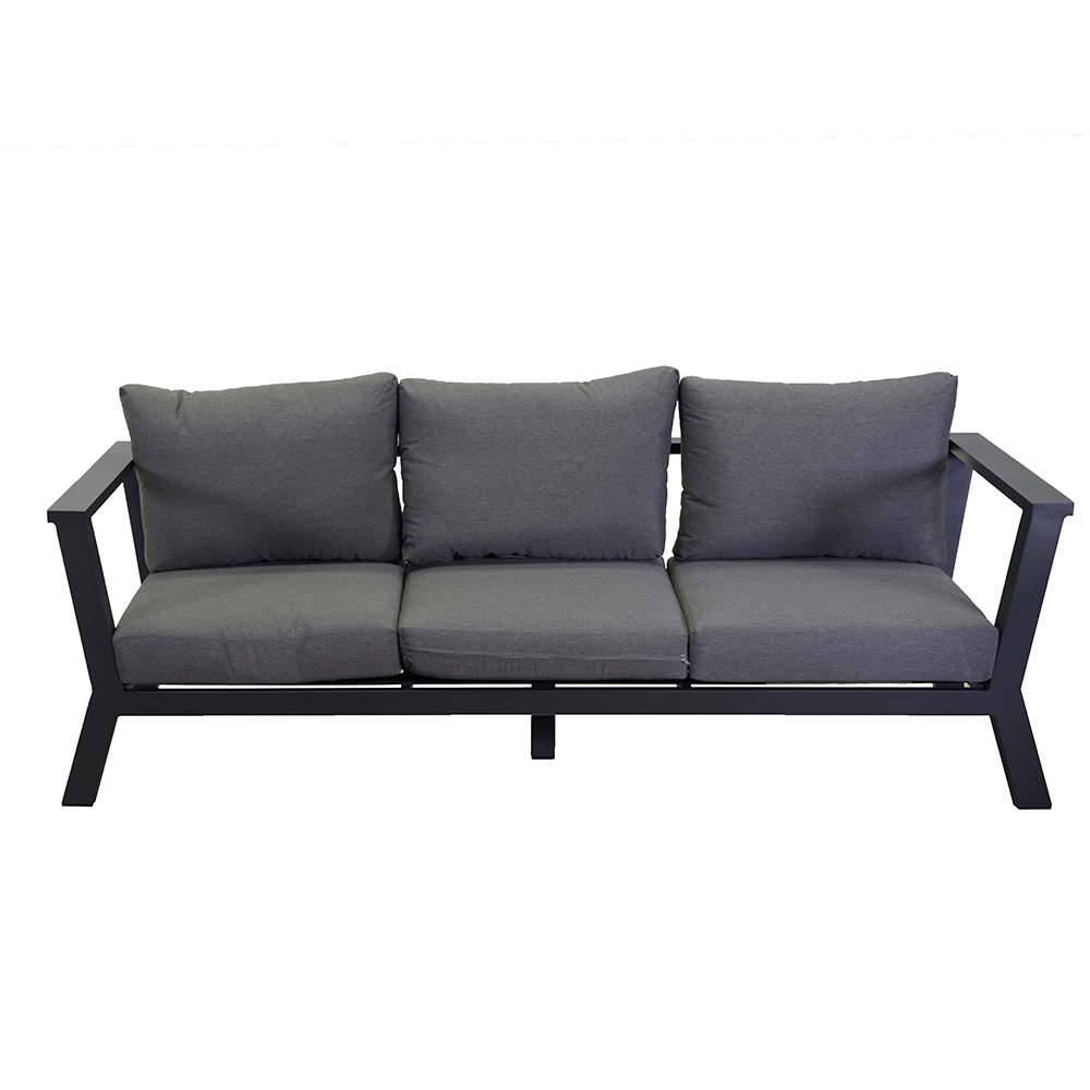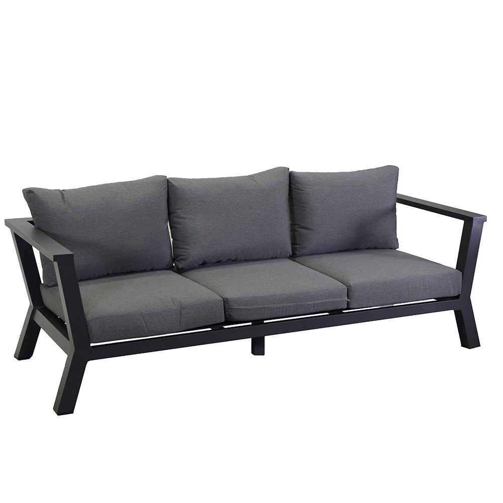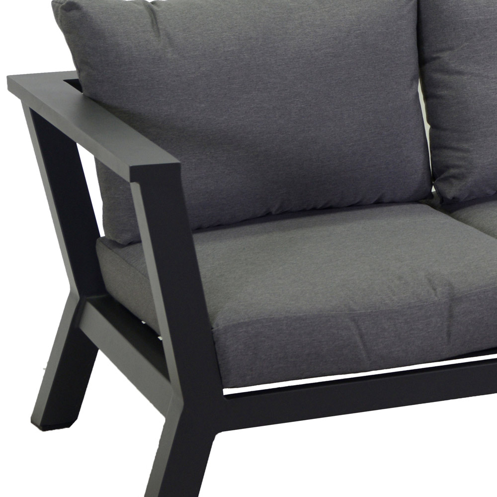 Outdoor-Sofa mit anthrazit pulverbeschichtetem Aluminiumrahmen, Sitz- und Rückenkissen aus 100% wasserfestem grauem Polyestergewebe, abnehmbare Bezüge.