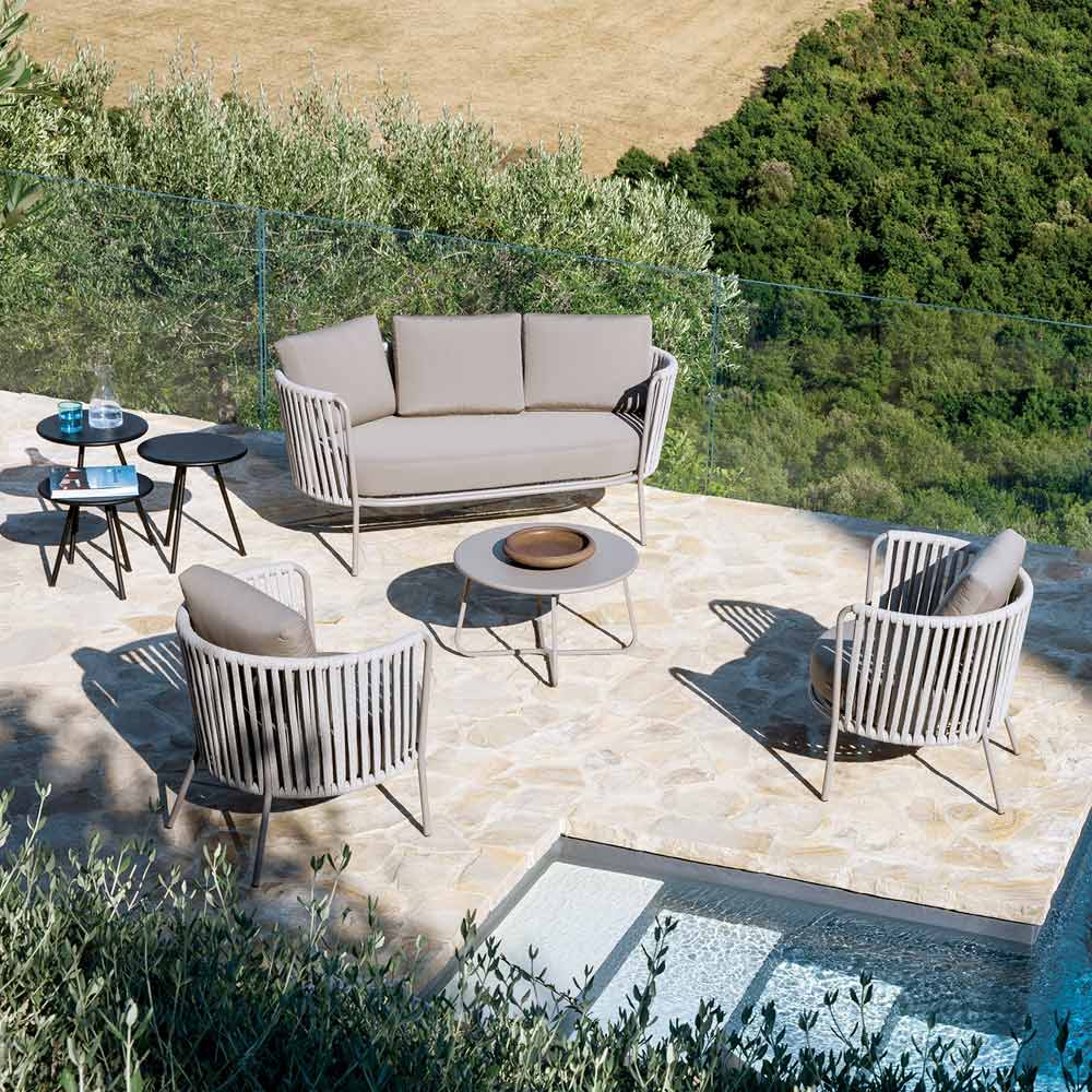 Die Edelstahlstruktur garantiert Stabilität und Witterungsbeständigkeit, während das Seilgeflecht Leichtigkeit und Eleganz verleiht und den Sitz wie eine bequeme Umarmung umhüllt. Das ergonomische Design und die abgerundeten Linien sorgen für ein angenehmes und entspannendes Sitzerlebnis.
